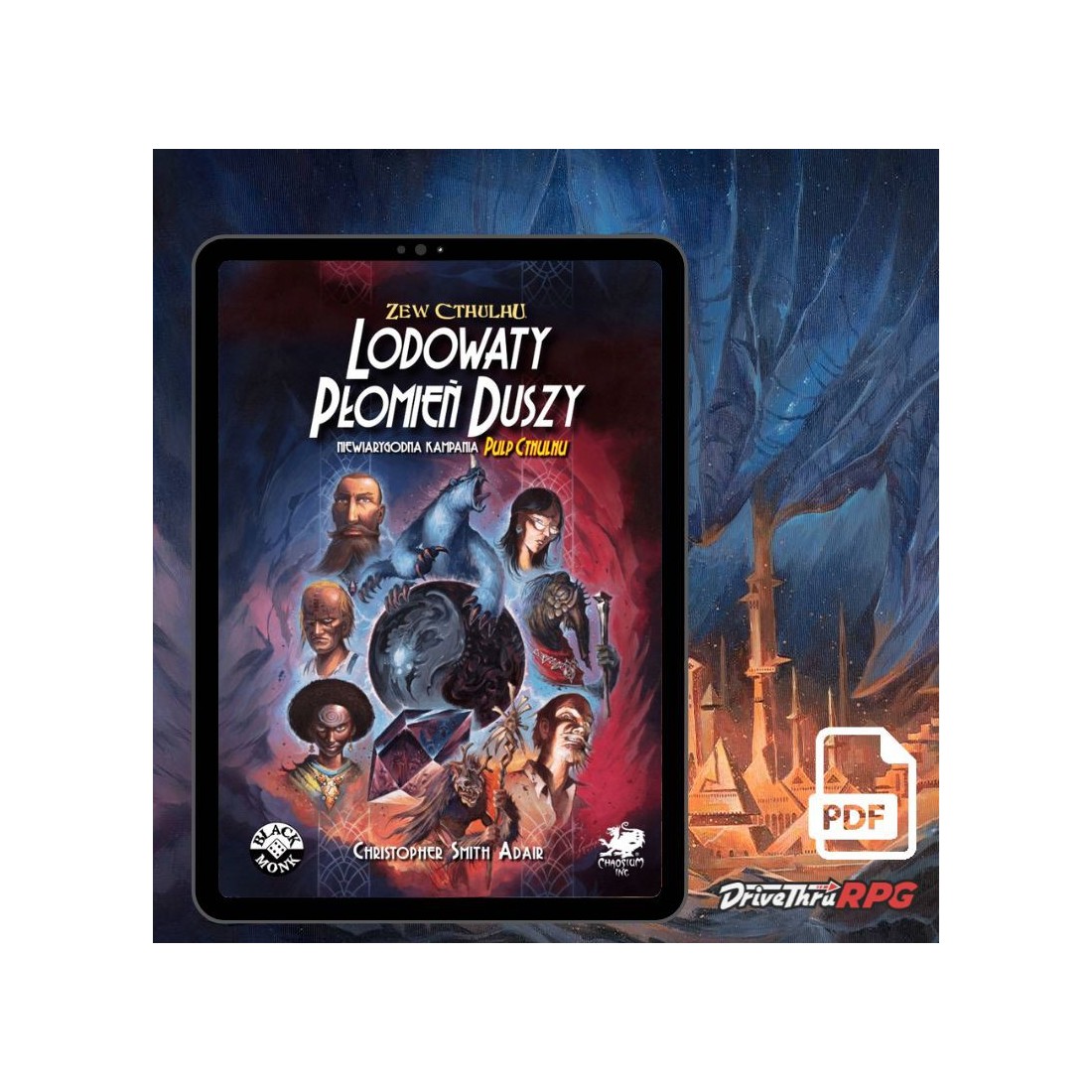 Lodowaty płomień duszy to pełna, sześcioczęściowa kampania do Pulp Cthulhu, prezentująca nowe zasady i umiejętności związane z mocami parapsychicznymi, nowe zaklęcia, a także szczegóły dotyczące krainy K’n-yan i jej mieszkańców oraz nową organizację Bohaterów – Klub Otwartych Umysłów. Znajdziesz w niej także sześcioro gotowych Bohaterów.