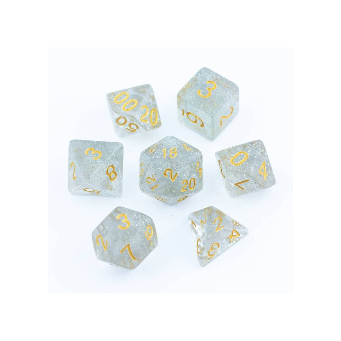 Te urocze kości przywołają uśmiech na twarzy nawet najbardziej marudnego gracza! Sprawdźcie sami! To niezwykłe połączenie przejrzystych kości i drobinek brokatu wniesie jeszcze więcej magii do Waszych sesji! Solidnie i precyzyjnie wykonane kości, dostępne są w wielu różnych barwach.