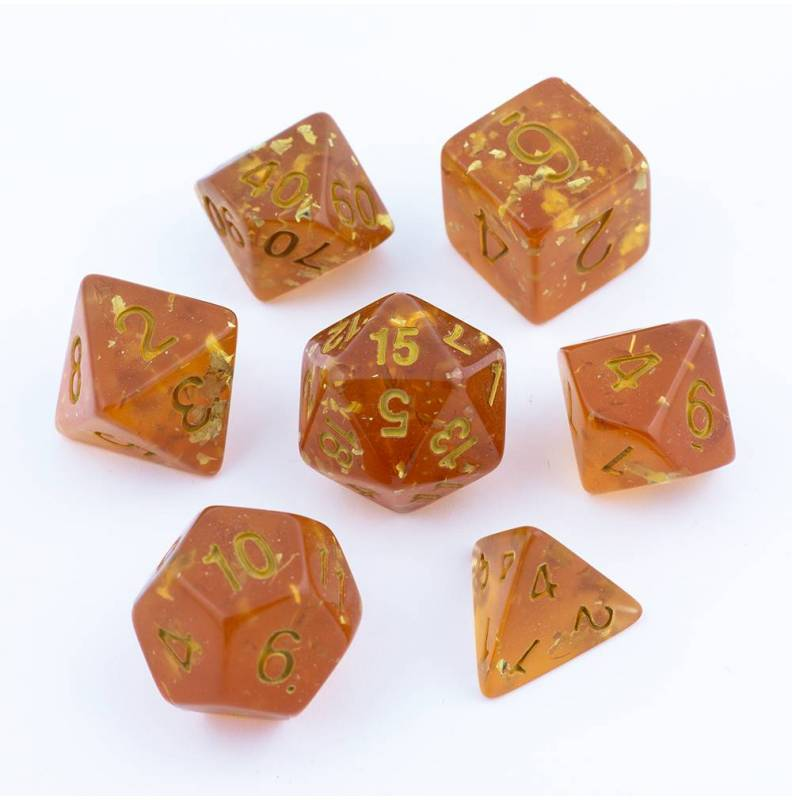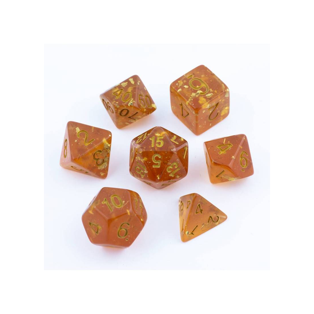 Brokatowo-pomarańczowe kości do gier fabularnych (RPG) - 7 sztuk w zestawie.