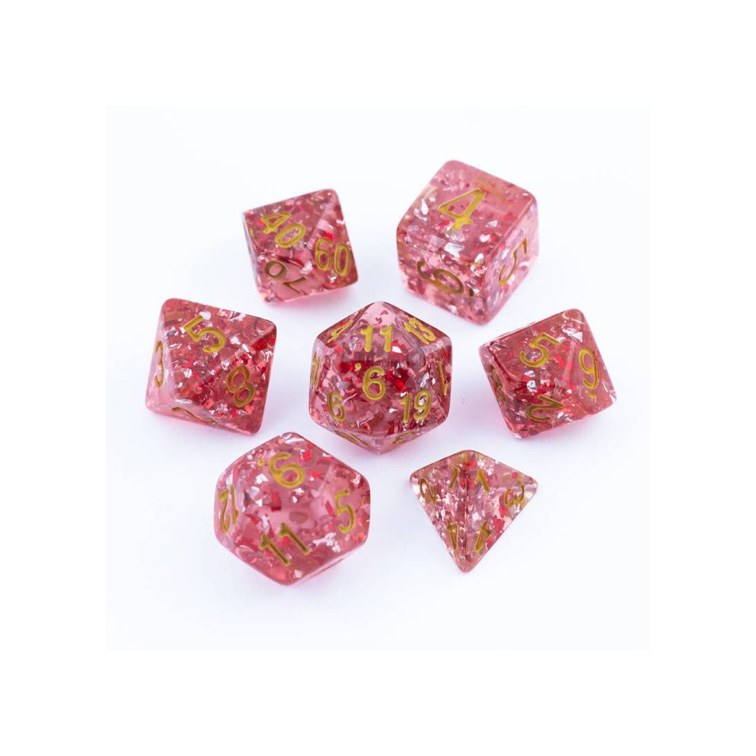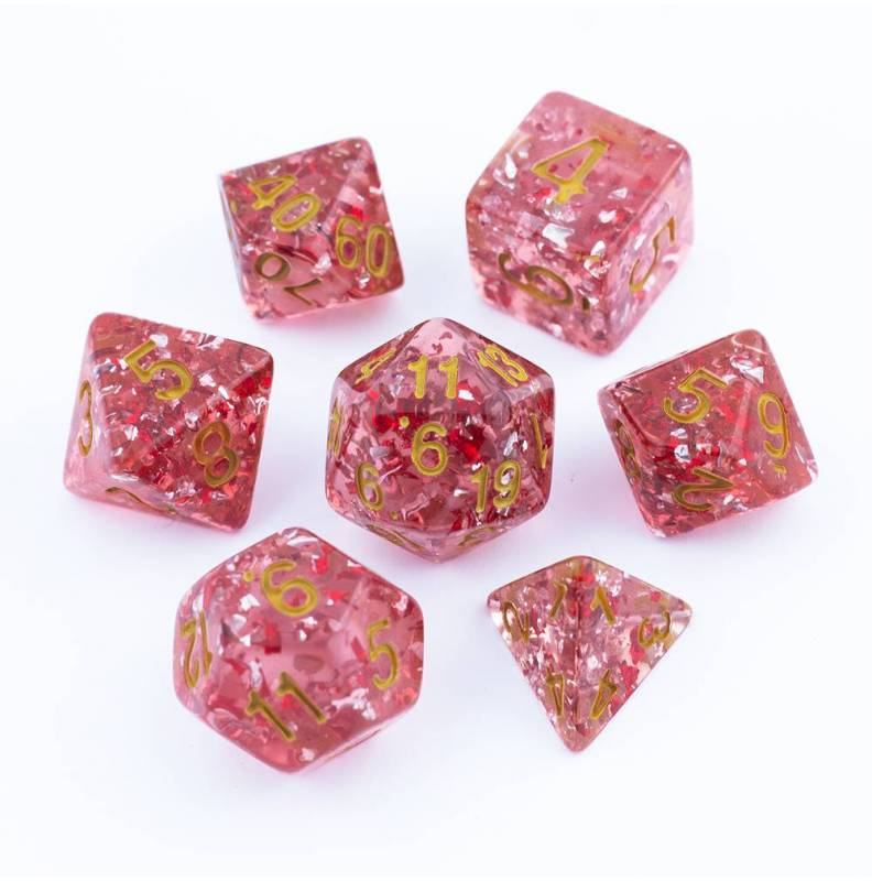 Brokatowo-czerwone kości do gier fabularnych (RPG) - 7 sztuk w zestawie.