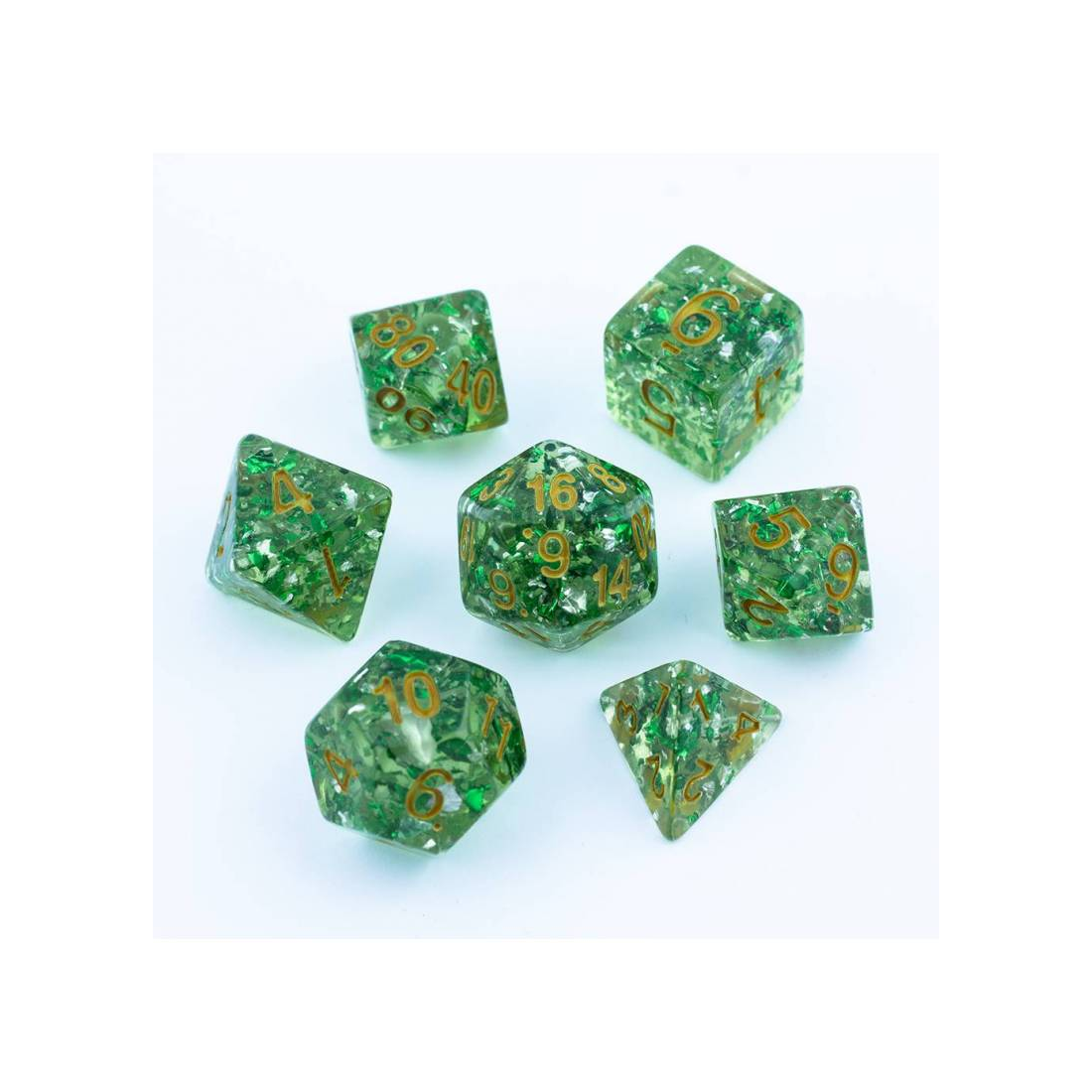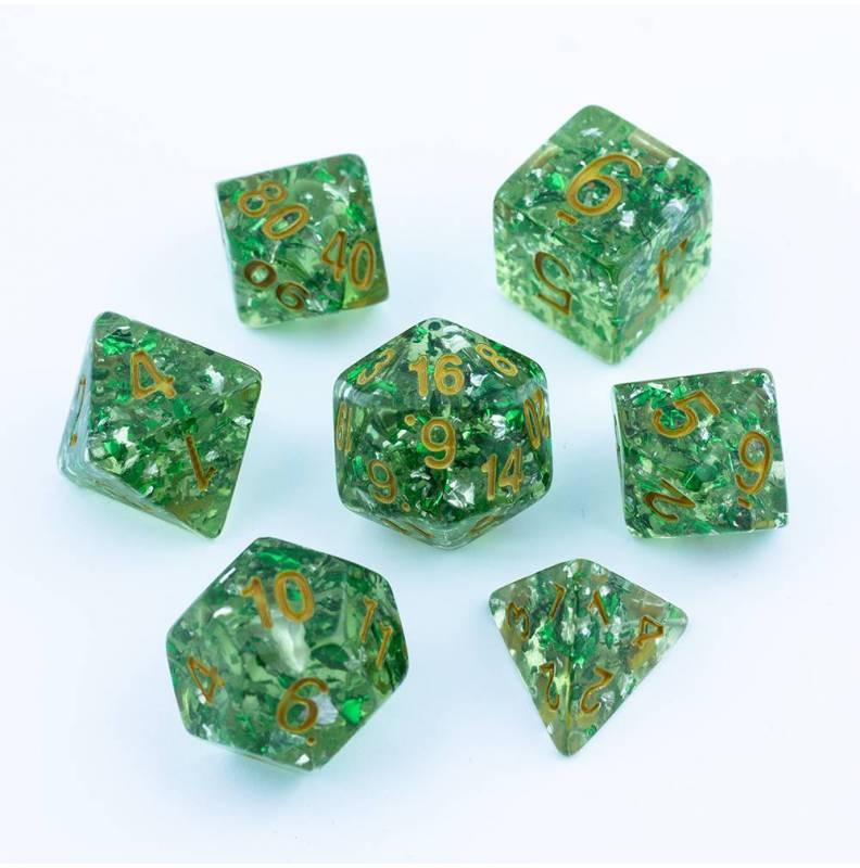 Brokatowo-zielone kości do gier fabularnych (RPG) - 7 sztuk w zestawie.