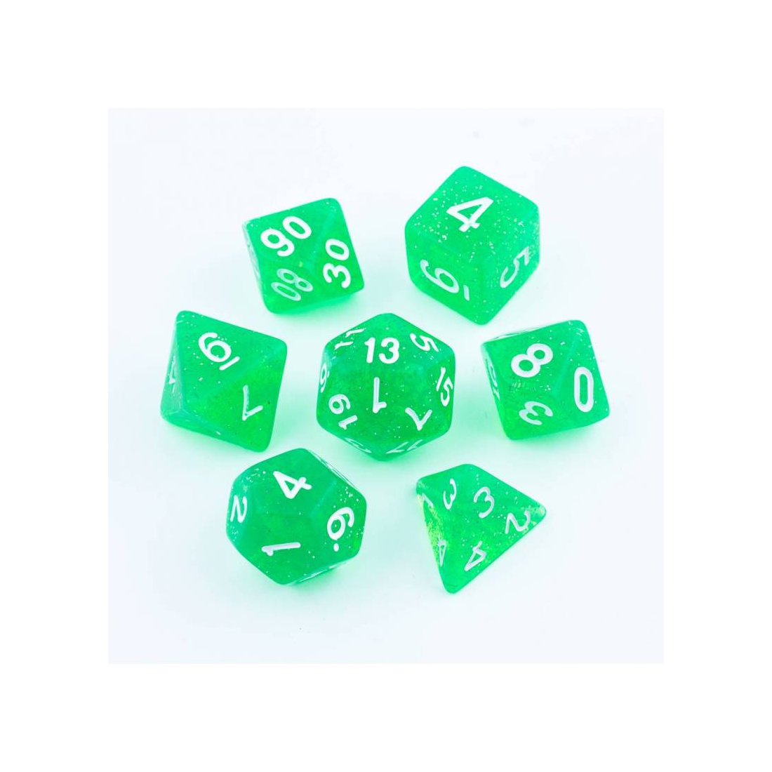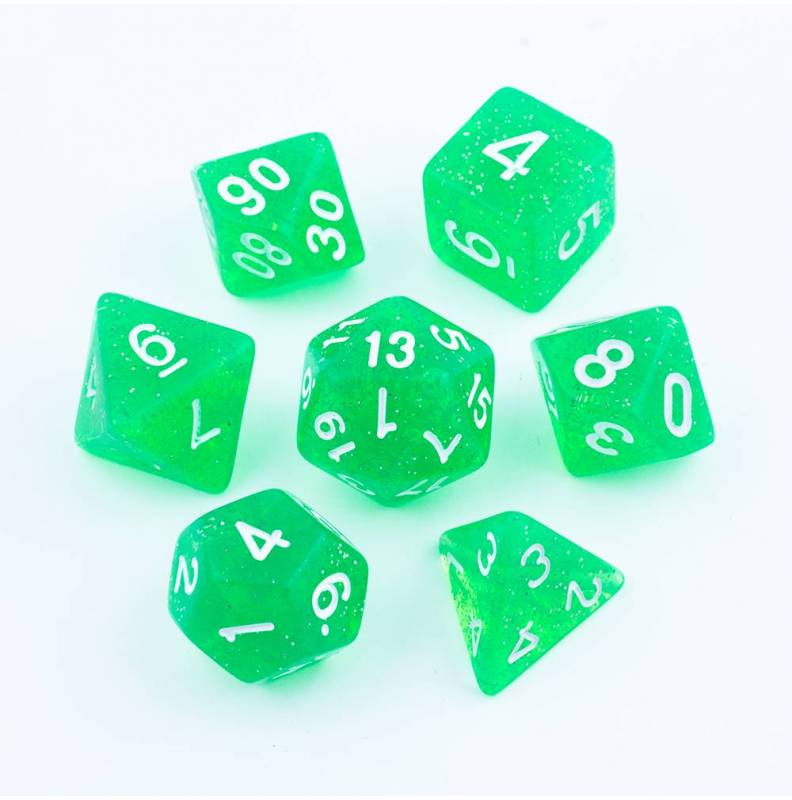 Brokatowo-zielone kości do gier fabularnych (RPG) - 7 sztuk w zestawie.