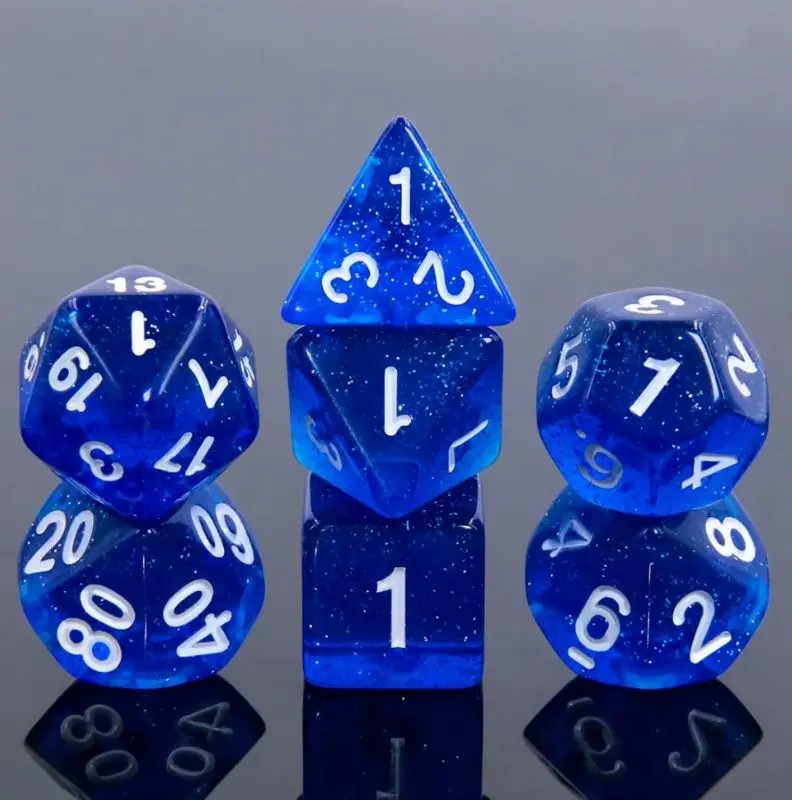 Kości pełne bezdennie głębokiego granatu, z delikatnym brokatem i bardzo wyraźnymi, białymi cyframi. To niezwykłe połączenie przejrzystych kości i drobinek brokatu wniesie jeszcze więcej magii do Waszych sesji! Solidnie i precyzyjnie wykonane kości, dostępne są w wielu różnych barwach.