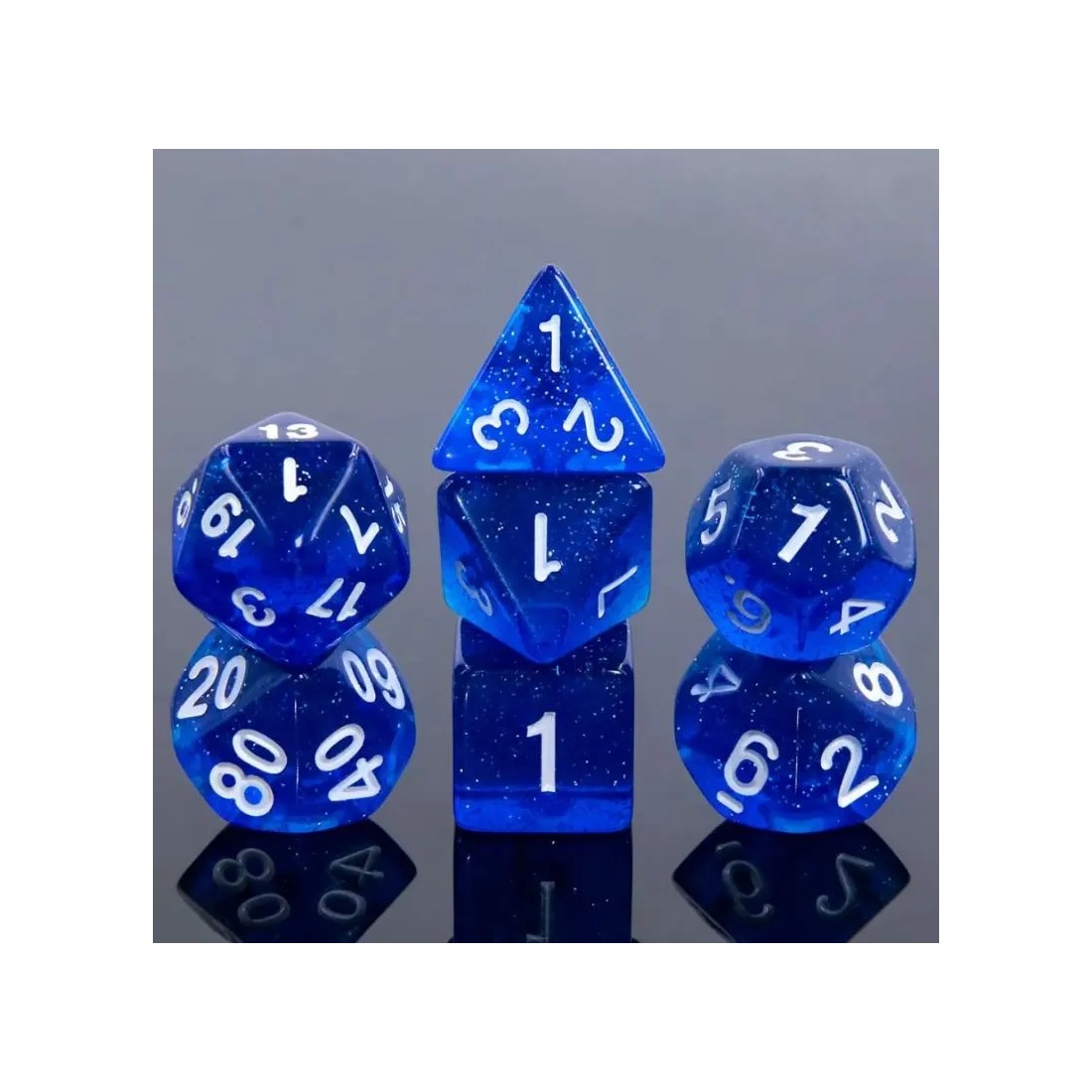 Granatowo-brokatowe kości do gier fabularnych (RPG) - 7 sztuk w zestawie.