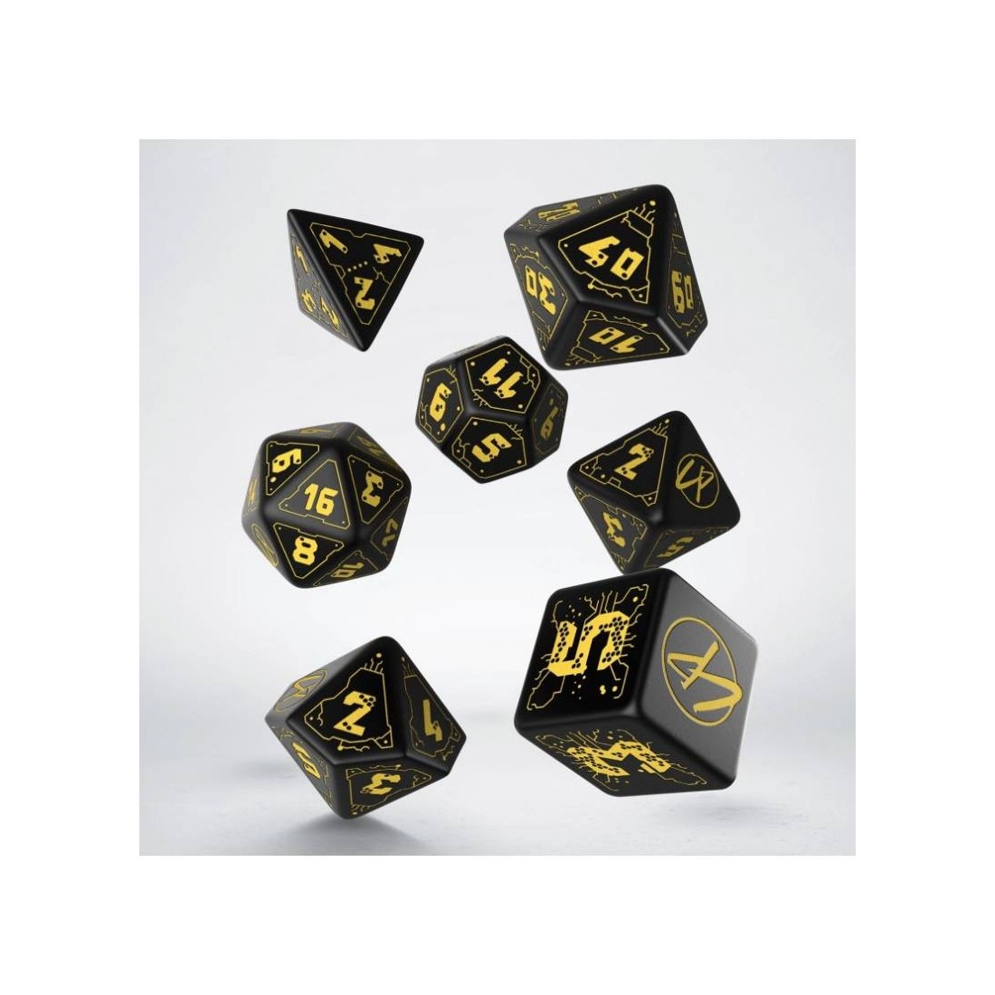 Zestaw 7 oficjalnych kości do gry fabularnej Cyberpunk RED wyprodukowanych przez Qworkshop.