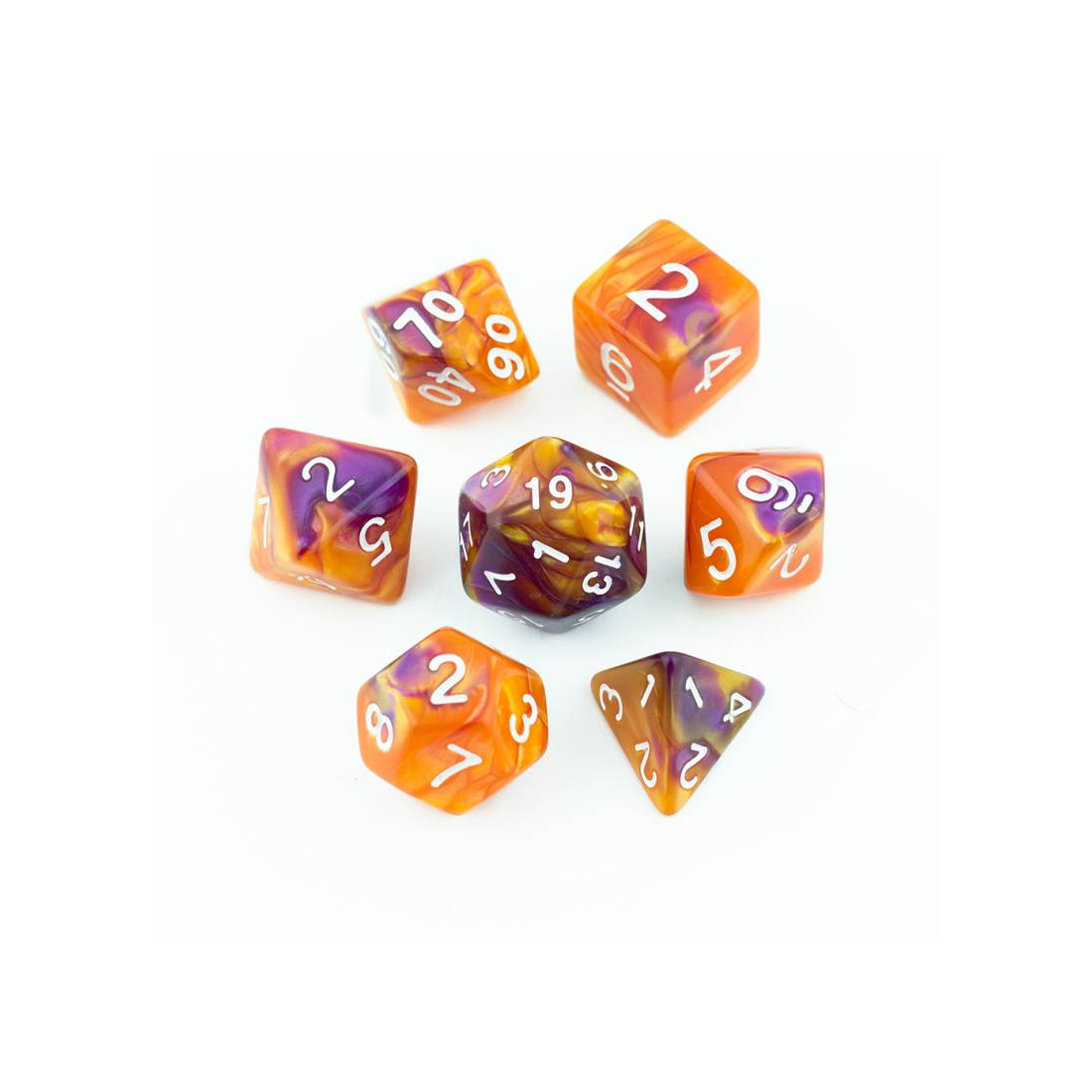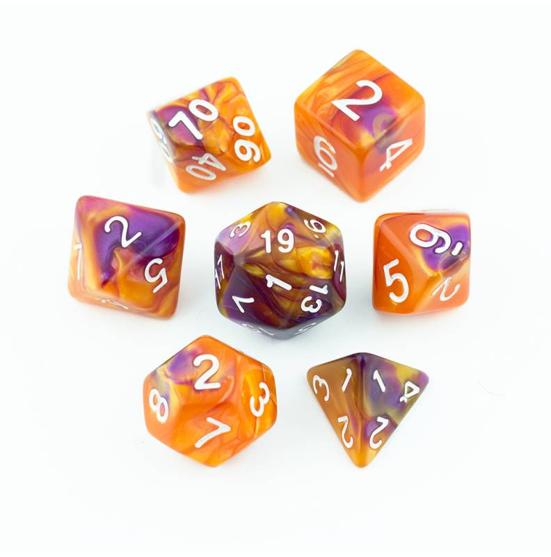 Pomarańczowo-fioletowe kości do gier fabularnych (RPG) - 7 sztuk w zestawie.