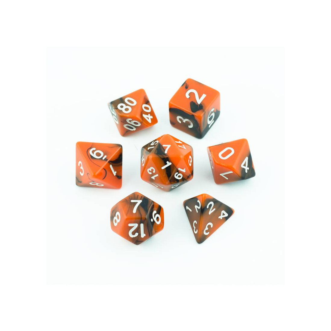 Pomarańczowo-czarne kości do gier fabularnych (RPG) - 7 sztuk w zestawie.