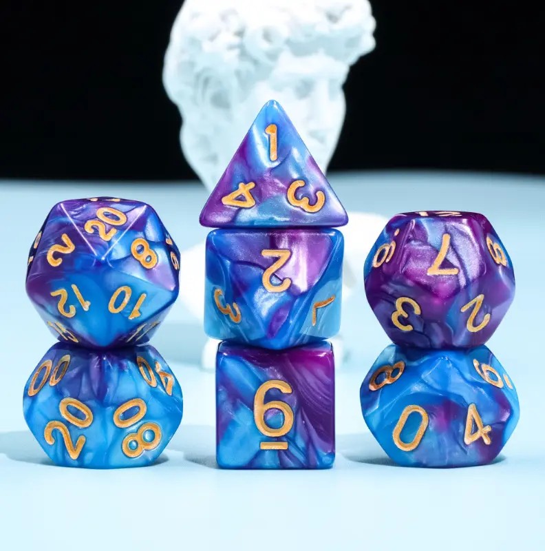 Niebiesko-fioletowe kości do gier fabularnych (RPG) - 7 sztuk w zestawie.