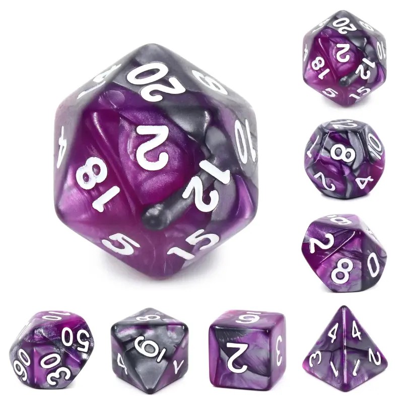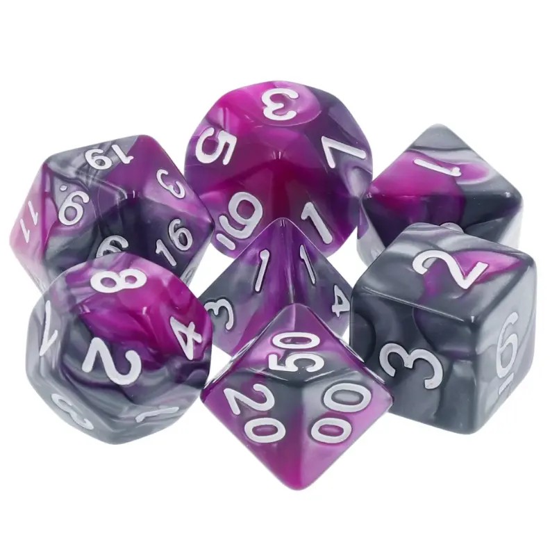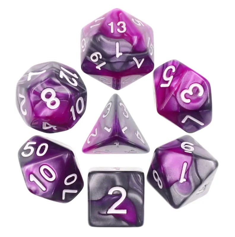Szaro-fioletowe kości do gier fabularnych (RPG) - 7 sztuk w zestawie.