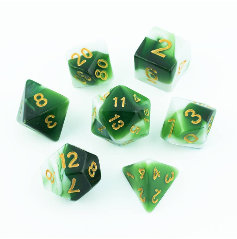 Biało-zielone kości do gier fabularnych (RPG) - 7 sztuk w zestawie.