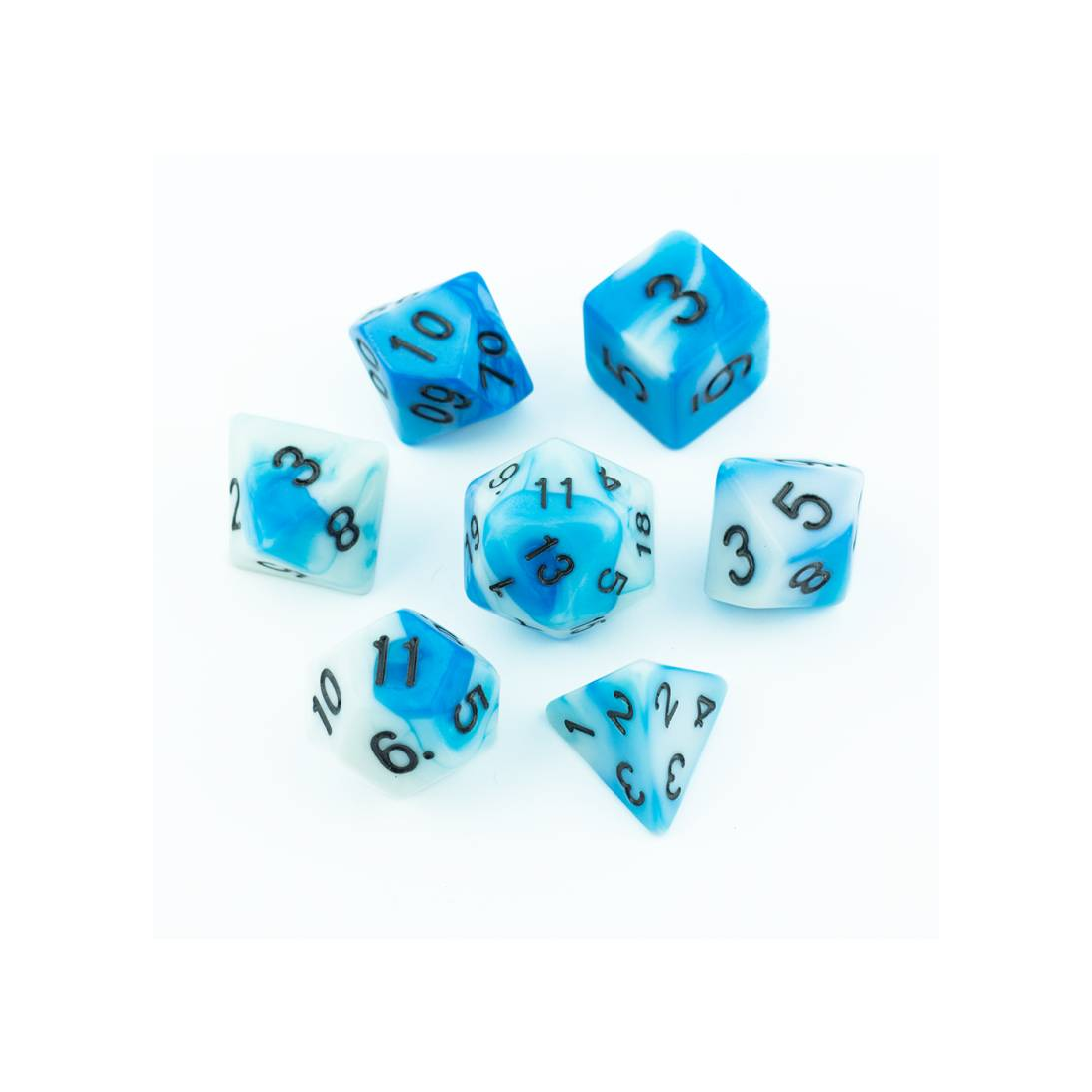 Biało-niebieskie kości do gier fabularnych (RPG) - 7 sztuk w zestawie.