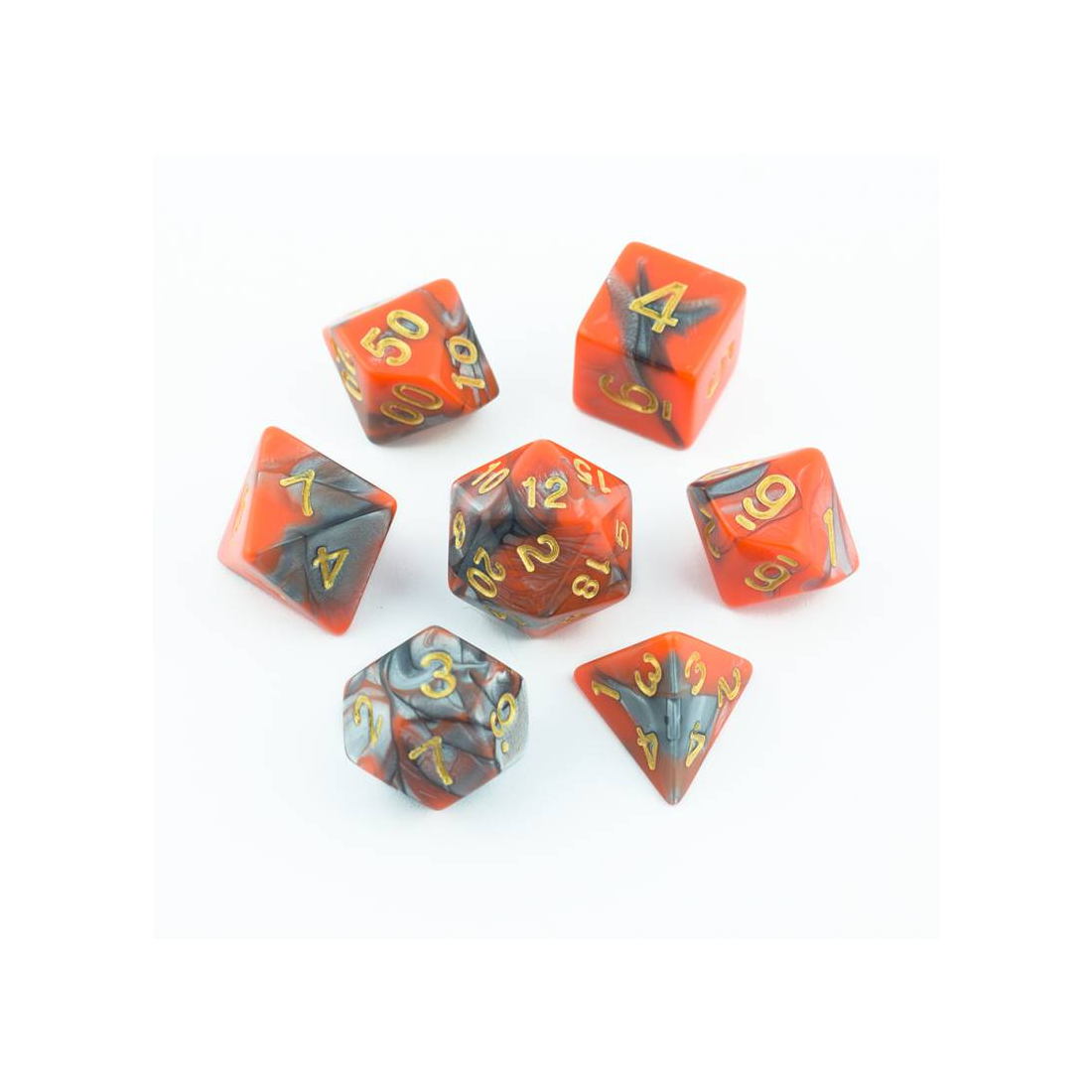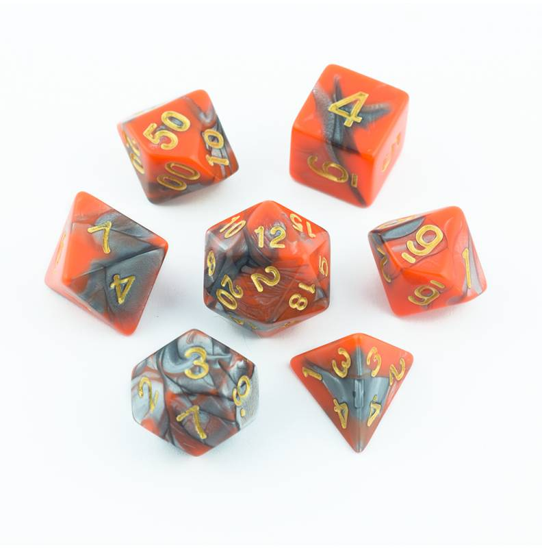Pomarańczowo-ciemnoszare kości do gier fabularnych (RPG) - 7 sztuk w zestawie.