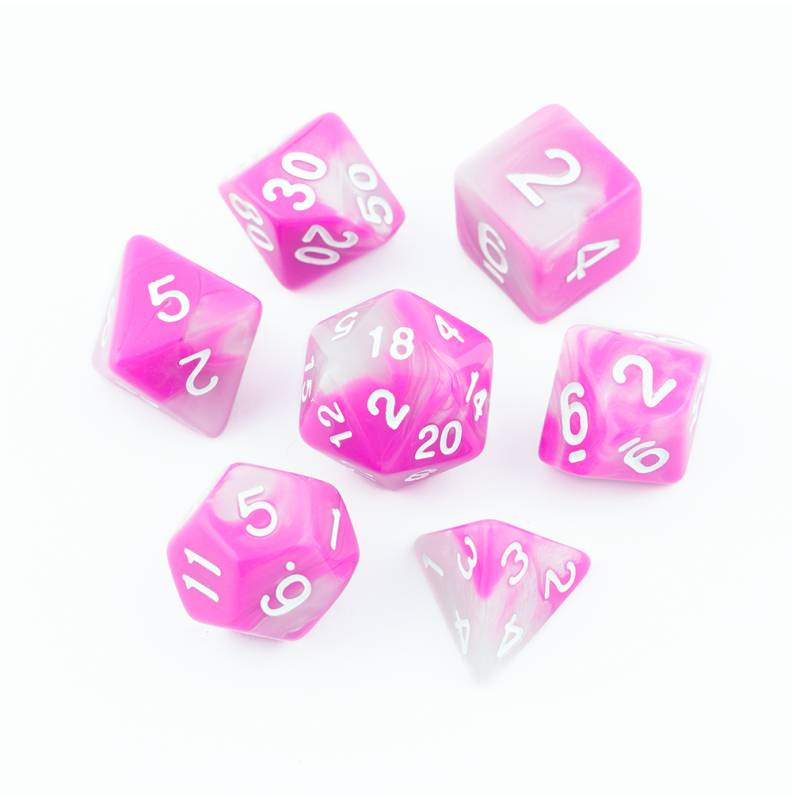 Biało-różowe kości do gier fabularnych (RPG) - 7 sztuk w zestawie.