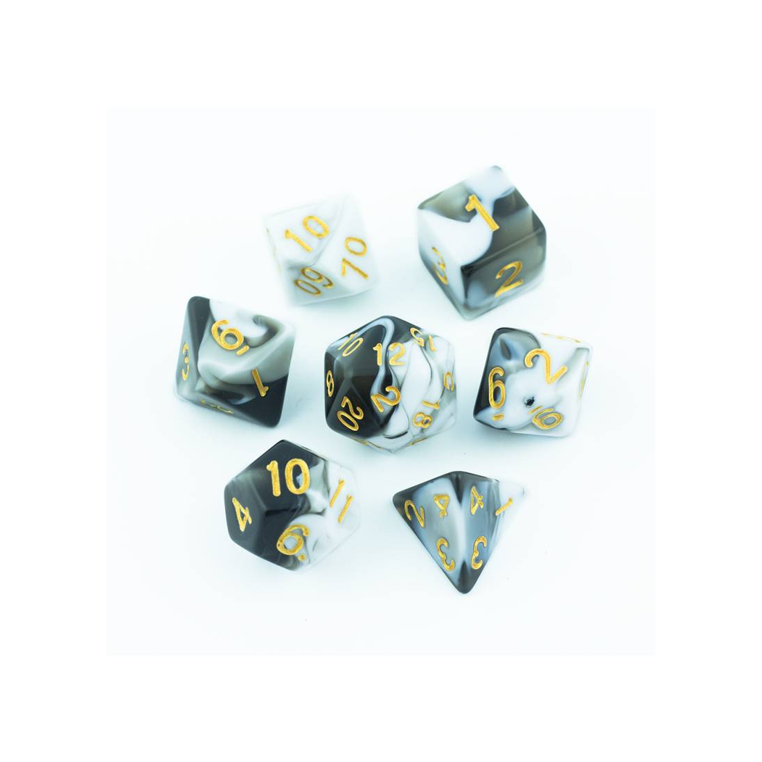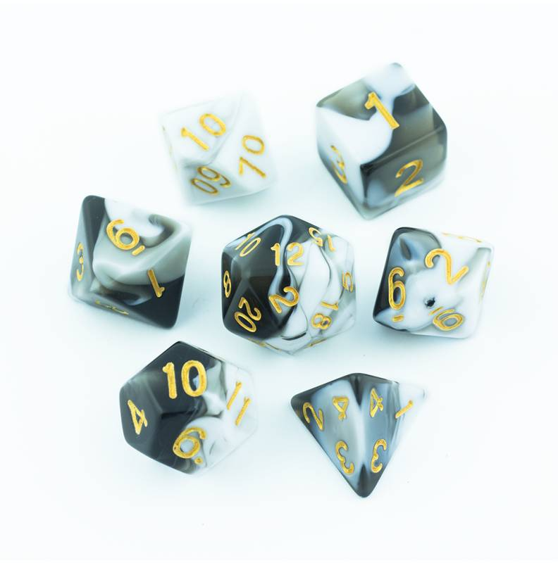 Biało-czarne kości do gier fabularnych (RPG) - 7 sztuk w zestawie.