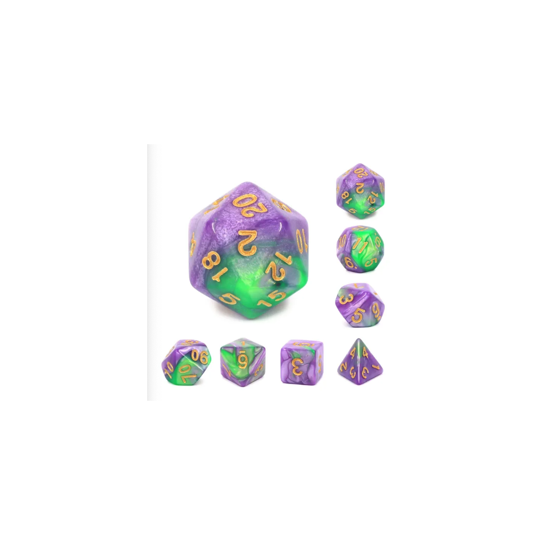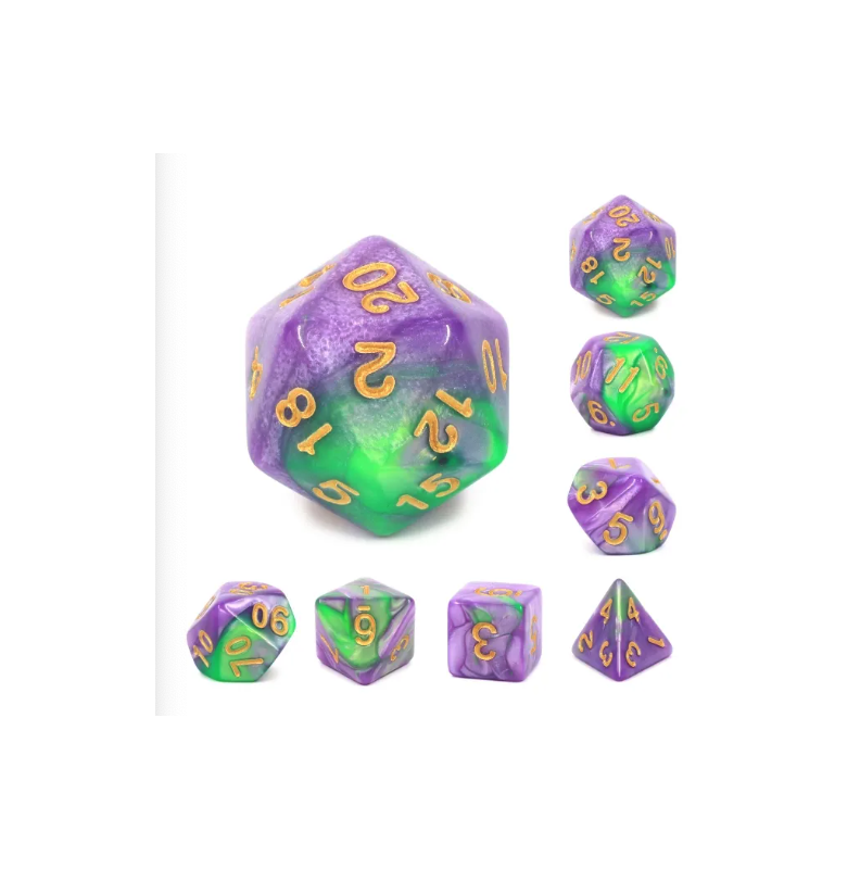 Fioletowo-zielone kości do gier fabularnych (RPG) - 7 sztuk w zestawie.