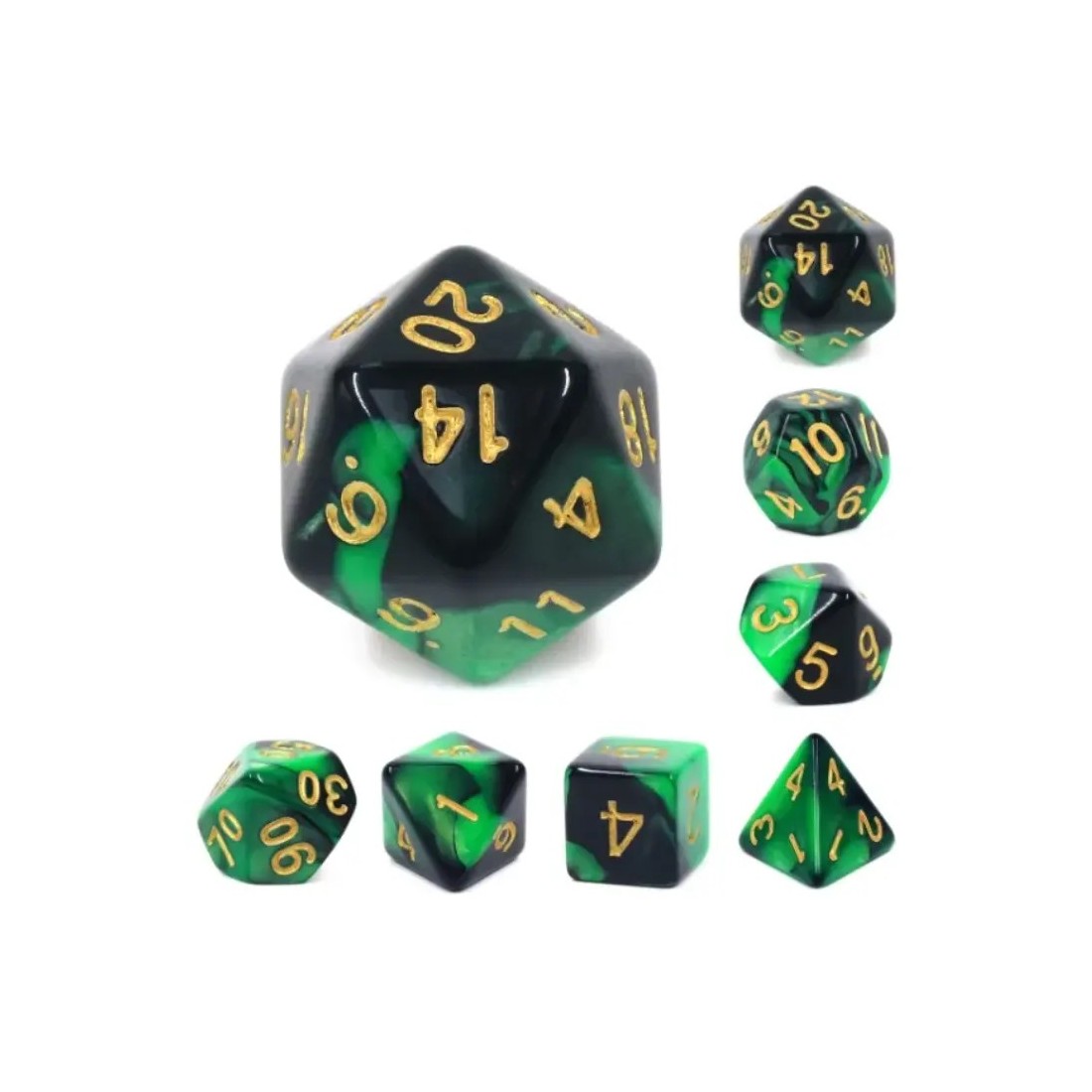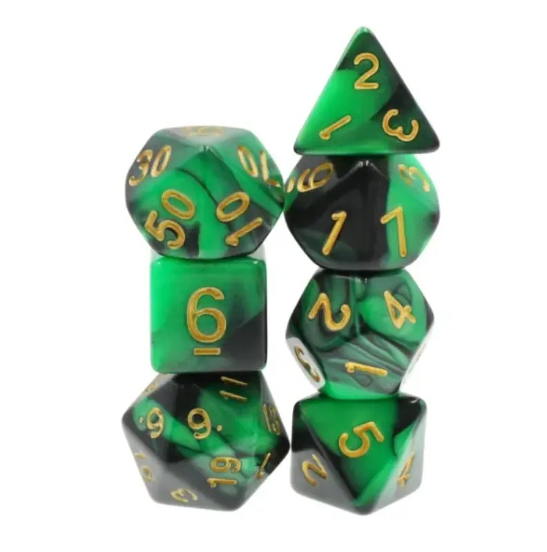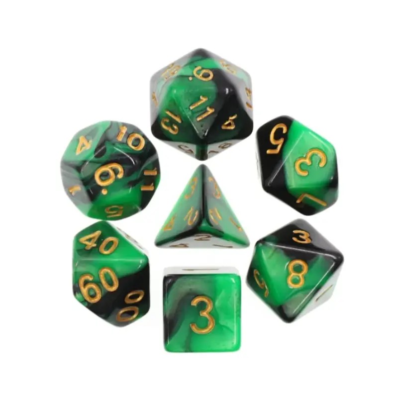 Zielono-czarne kości do gier fabularnych (RPG) - 7 sztuk w zestawie.