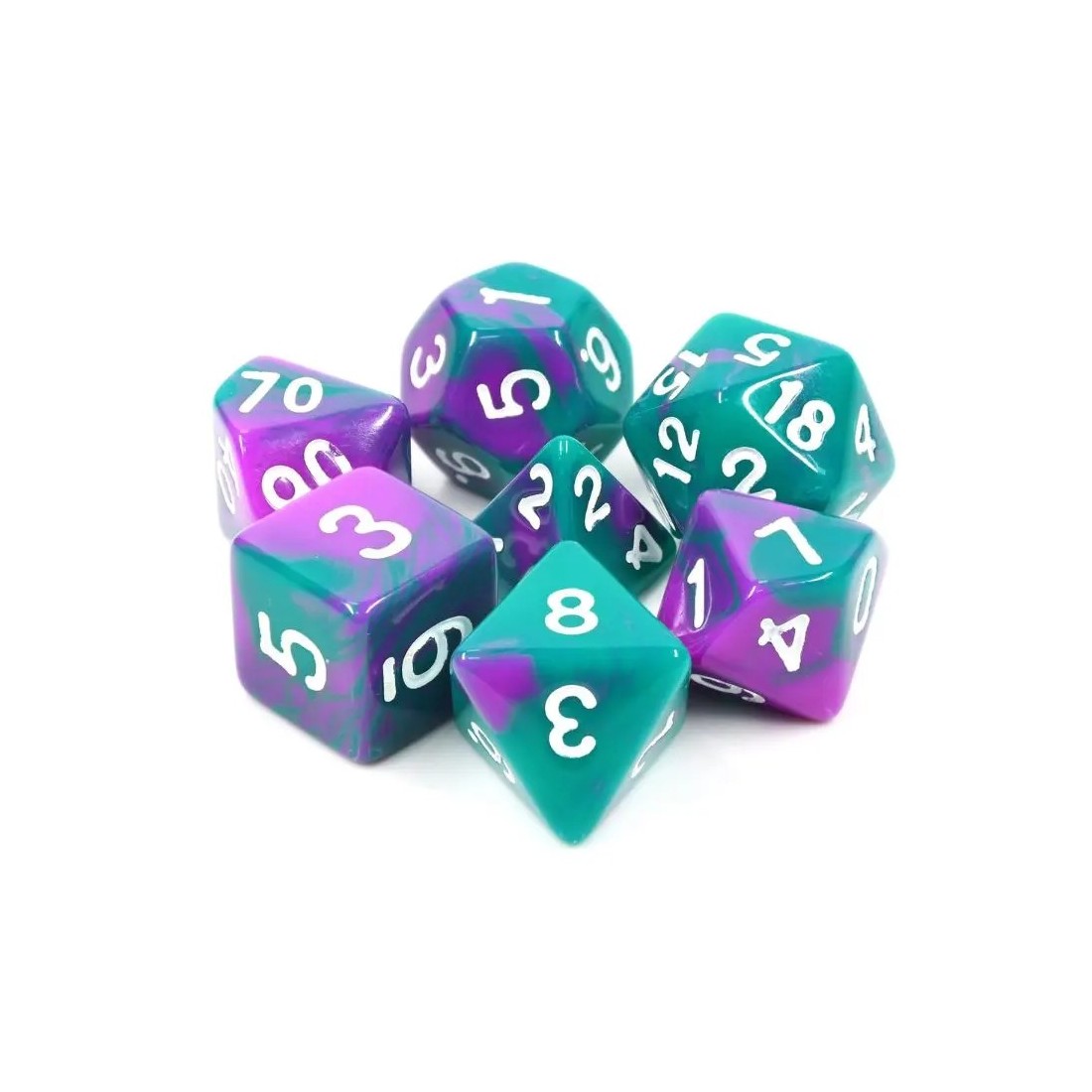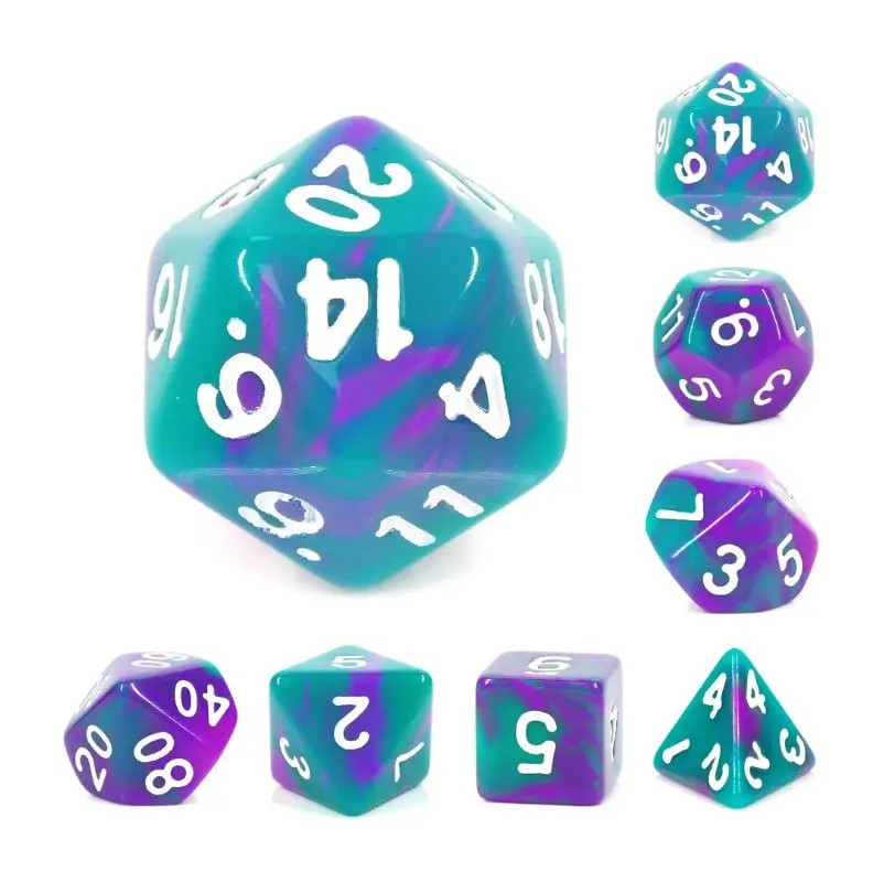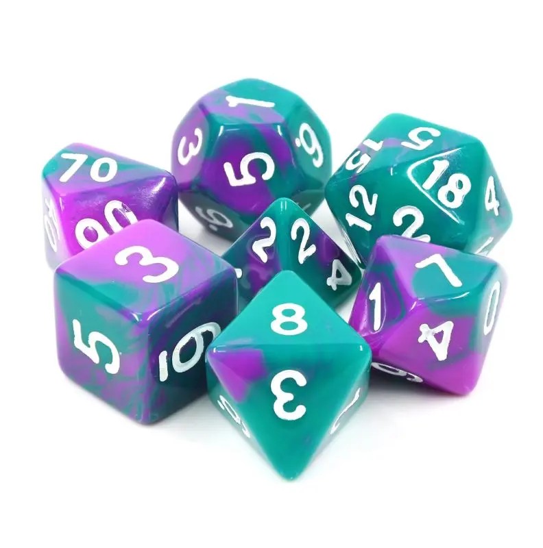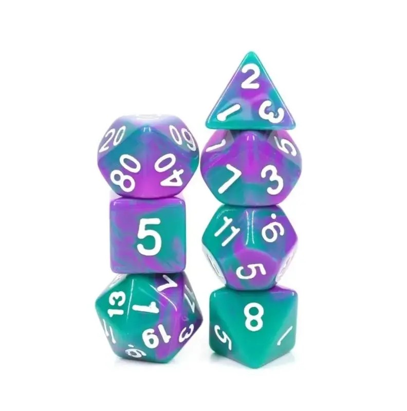 Zielono-fioletowe kości do gier fabularnych (RPG) - 7 sztuk w zestawie.