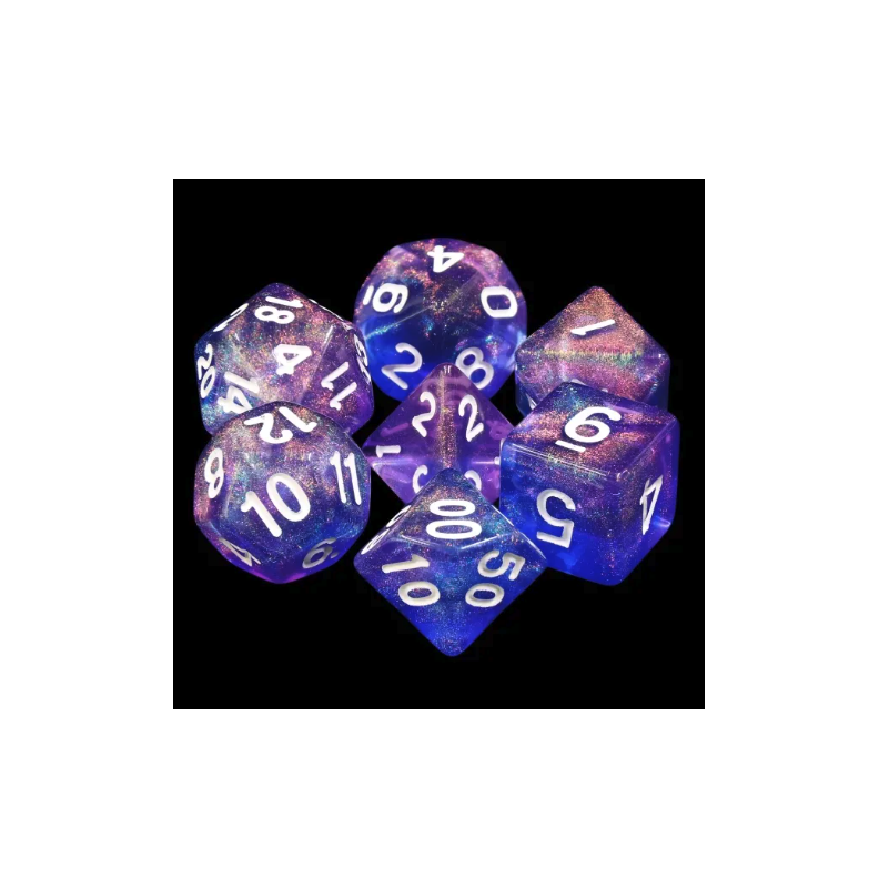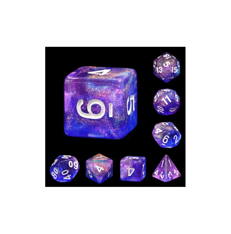 Galaktyczne niebiesko-fioletowe kości do gier fabularnych (RPG) - 7 sztuk w zestawie.