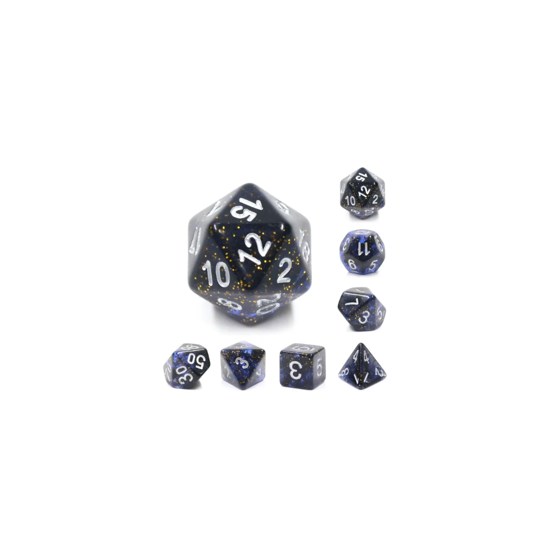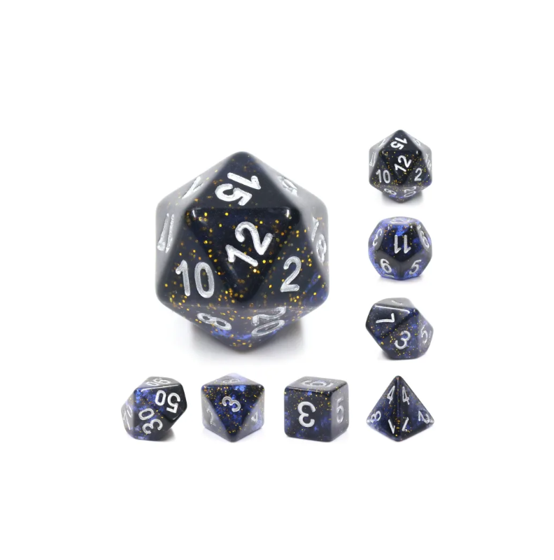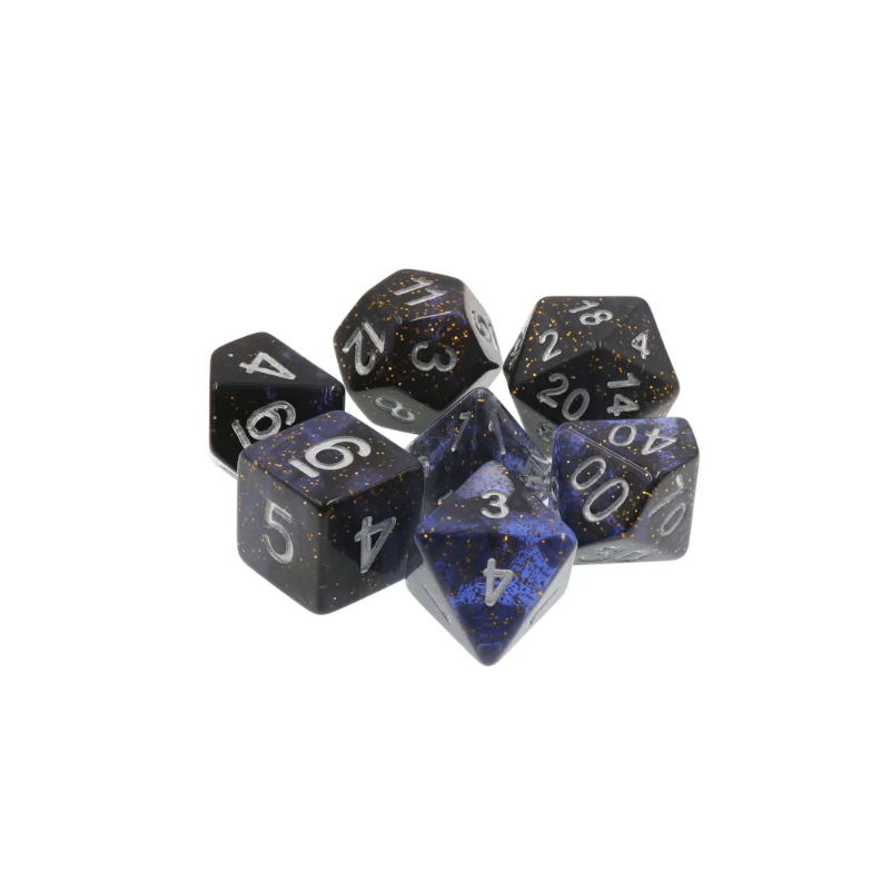 Galaktyczne granatowo-czarne kości do gier fabularnych (RPG) - 7 sztuk w zestawie.