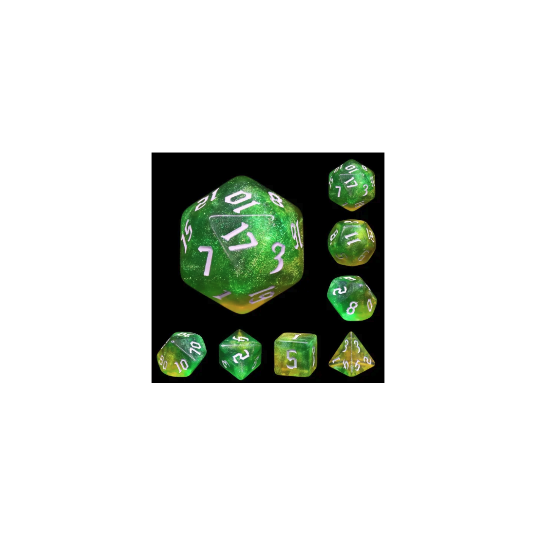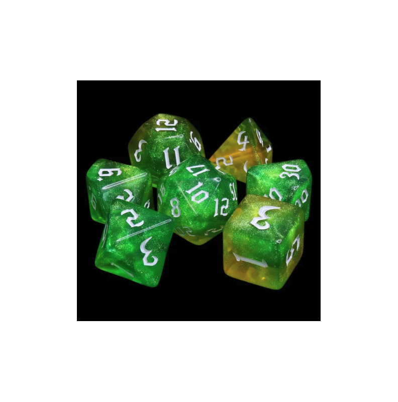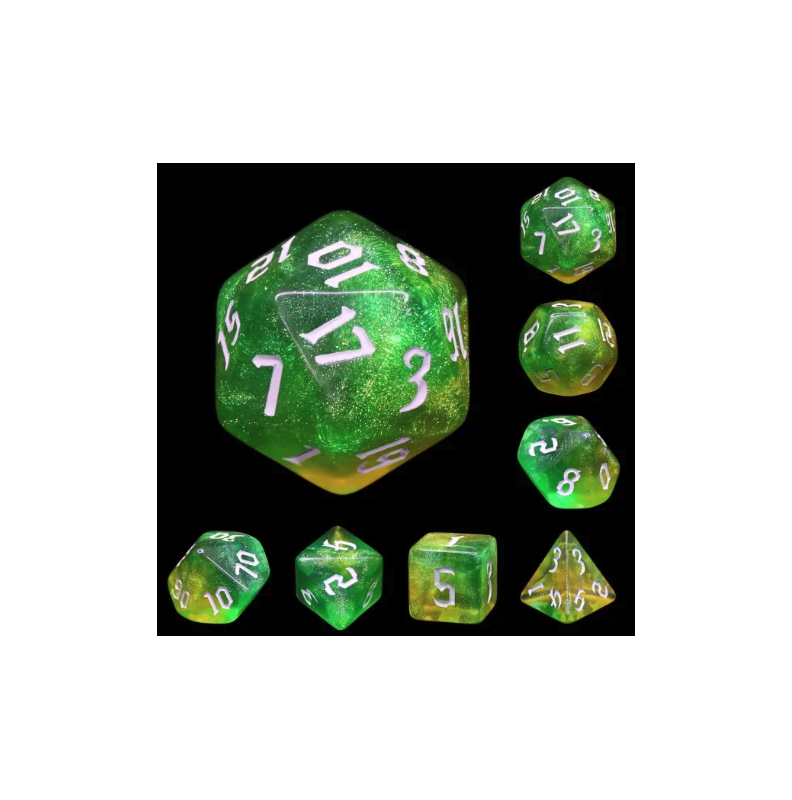 Galaktyczne zielono-żółte kości do gier fabularnych (RPG) - 7 sztuk w zestawie.