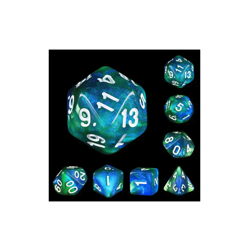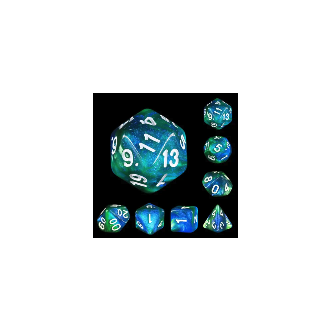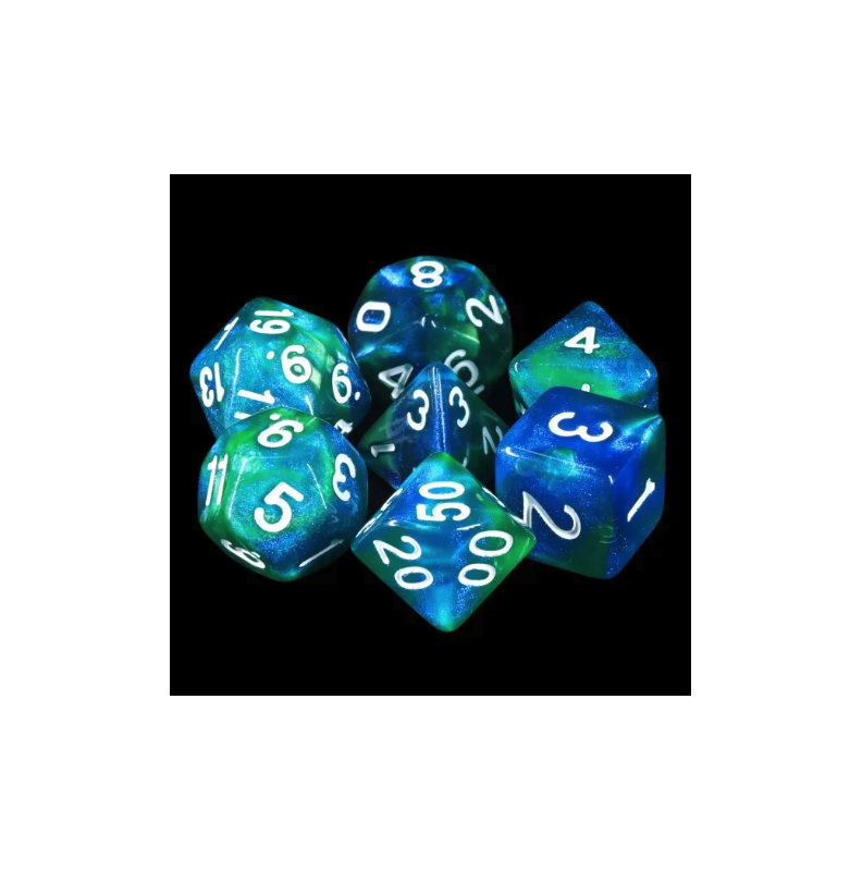 Galaktyczne niebiesko-zielone kości do gier fabularnych (RPG) - 7 sztuk w zestawie.