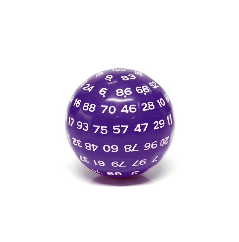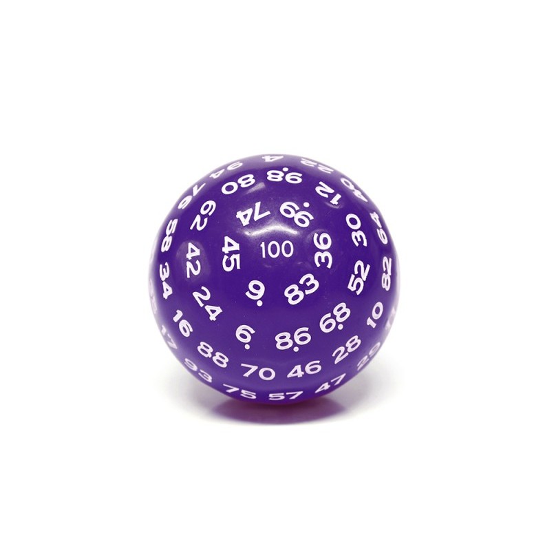 Fioletowo - białe kość k100 do gier fabularnych (RPG), 1 sztuka w zestawie. Średnica 49 mm. Dynamiczne łączenie dwóch kolorów nadaje tym kościom wyjątkowej wyrazistości.