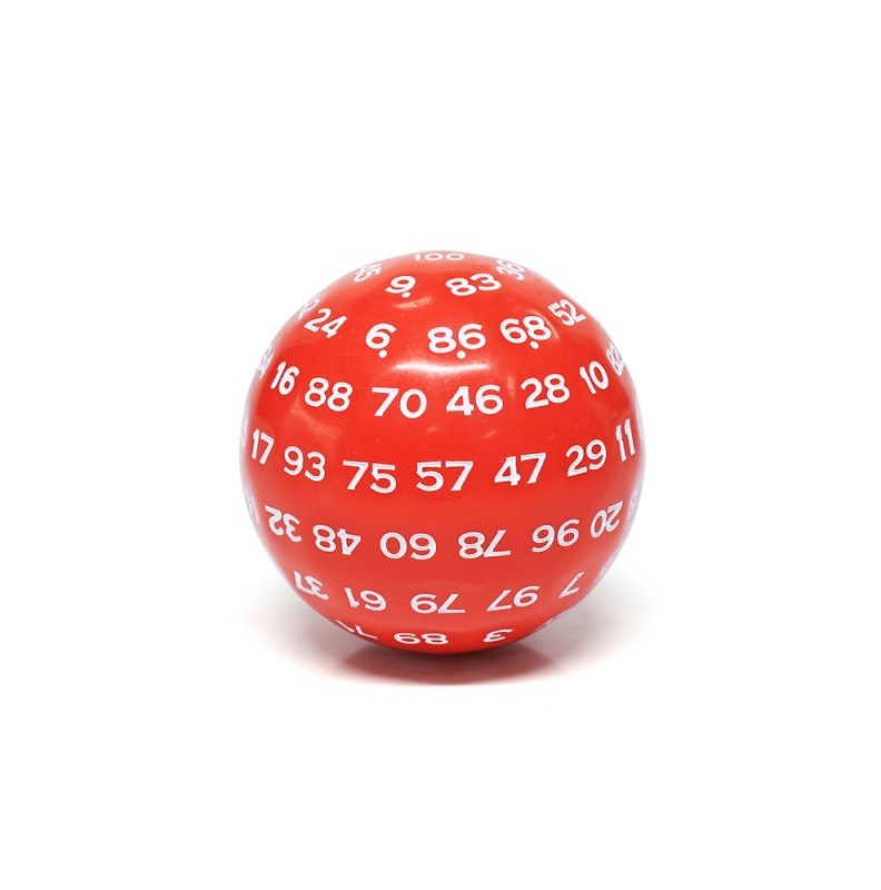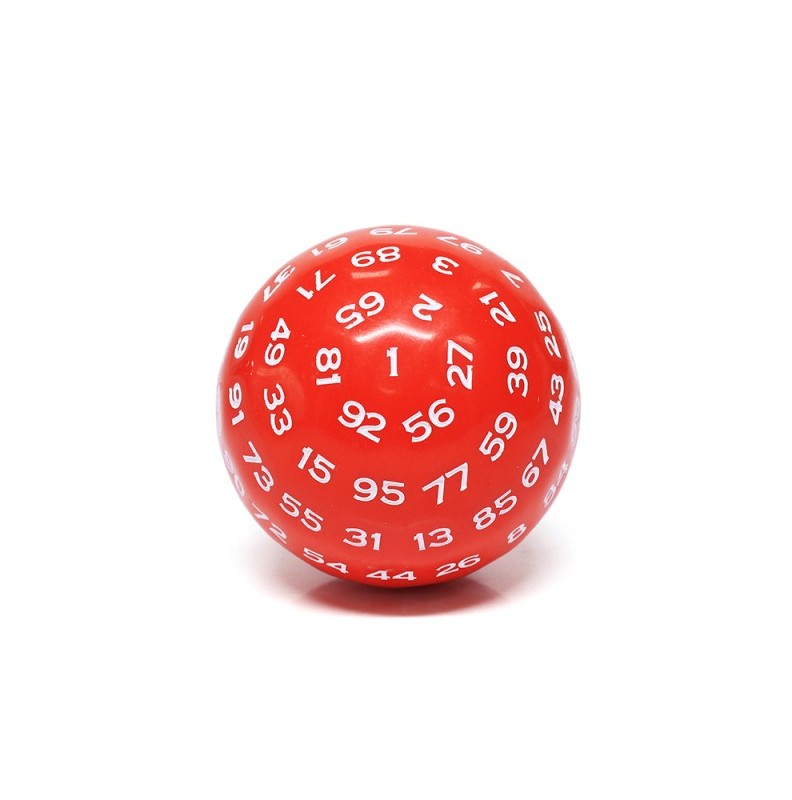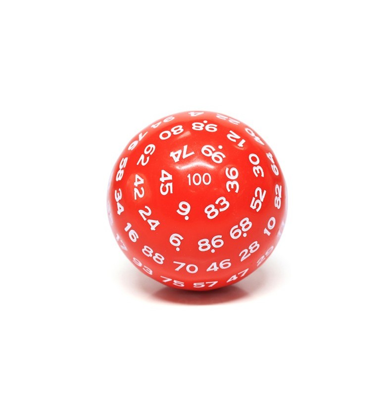 Czerwono - biała kość k100 do gier fabularnych (RPG), 1 sztuka w zestawie. Średnica 49 mm. Dynamiczne łączenie dwóch kolorów nadaje tym kościom wyjątkowej wyrazistości.