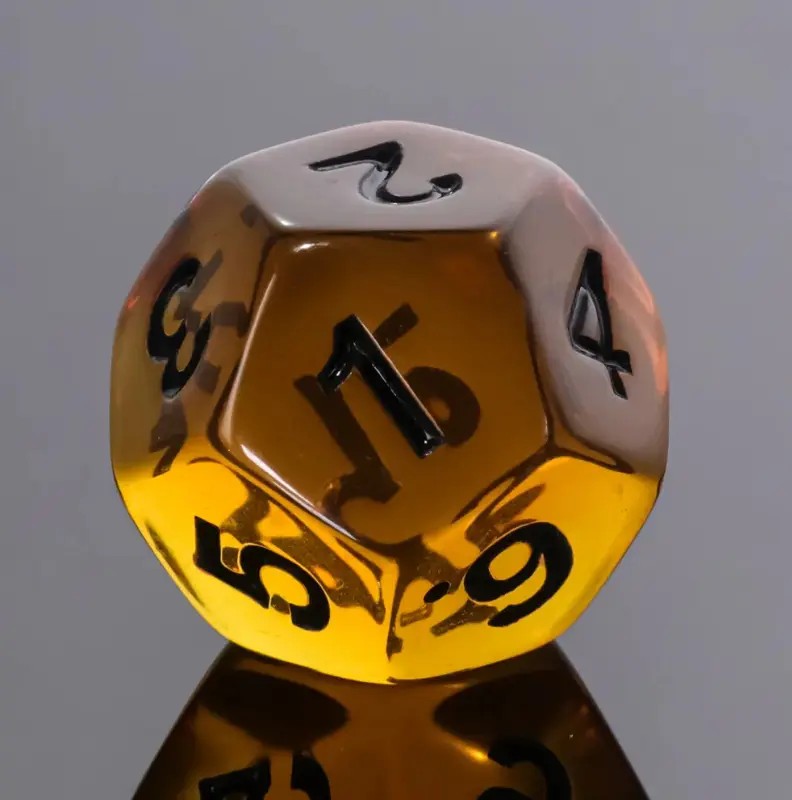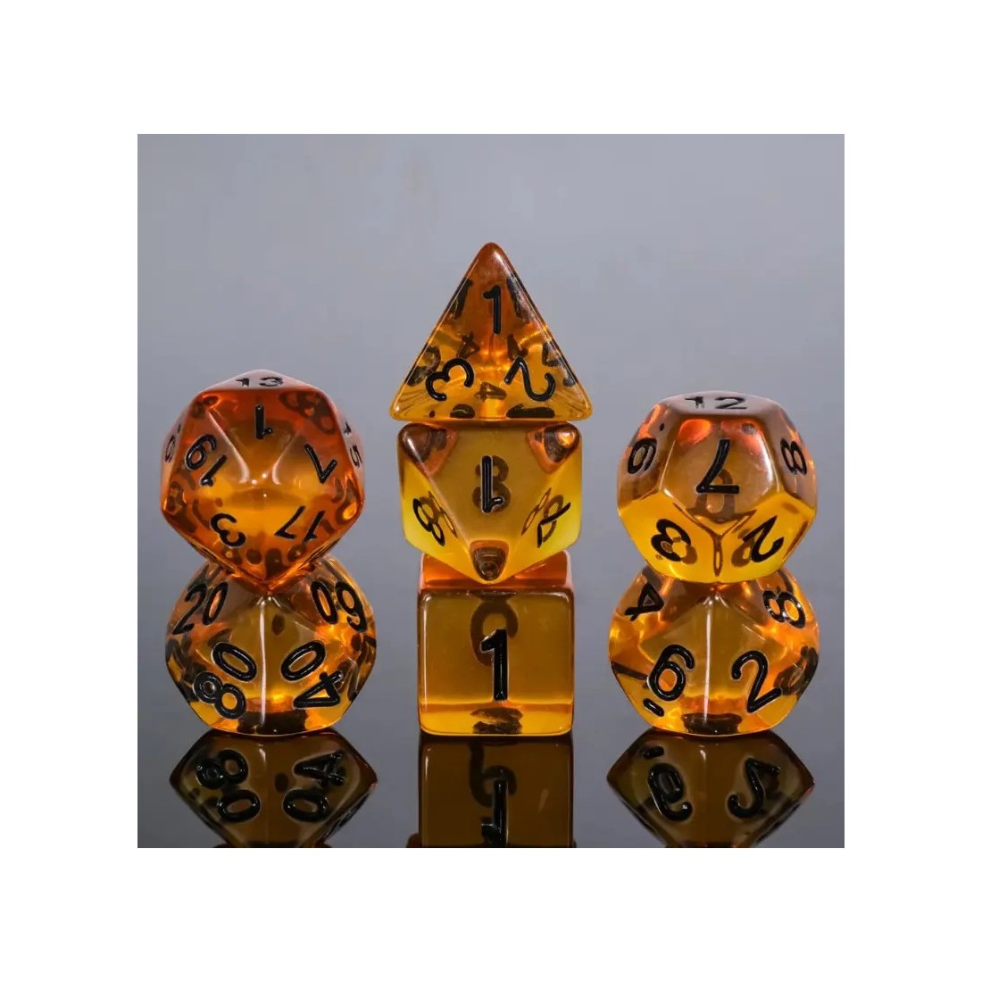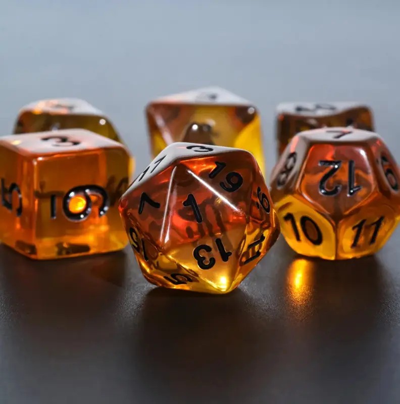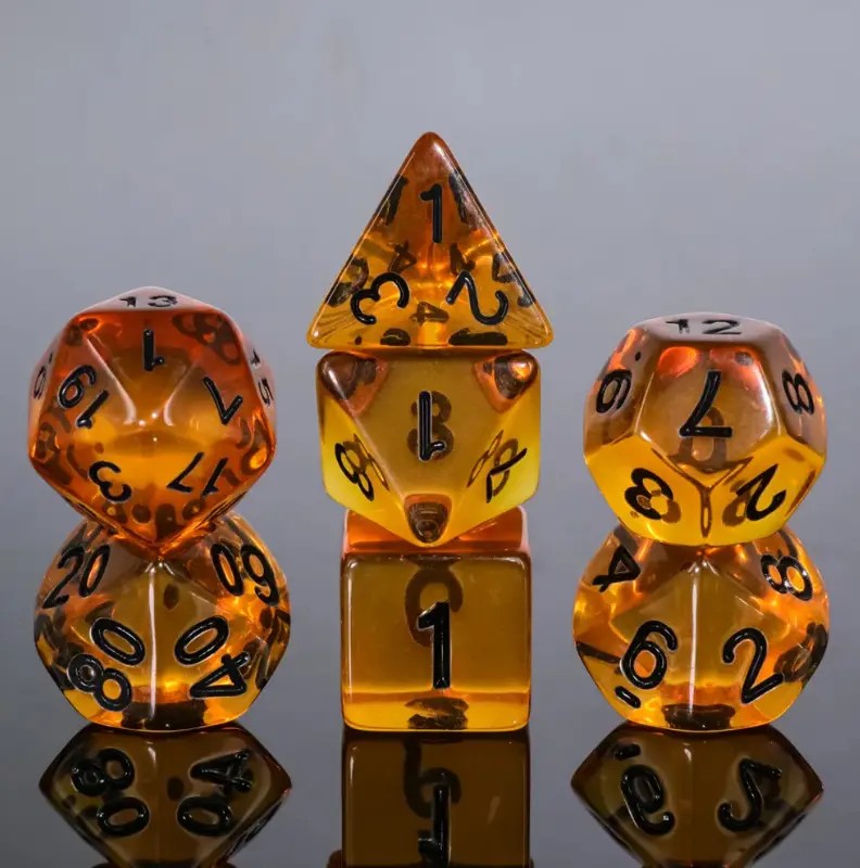 Kryształowe bursztynowe kości do gier fabularnych (RPG) - 7 sztuk w zestawie.