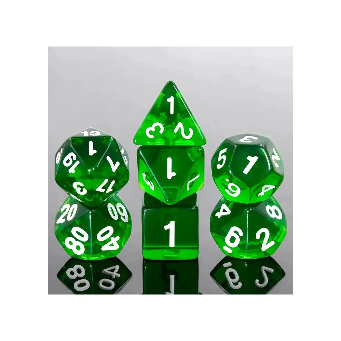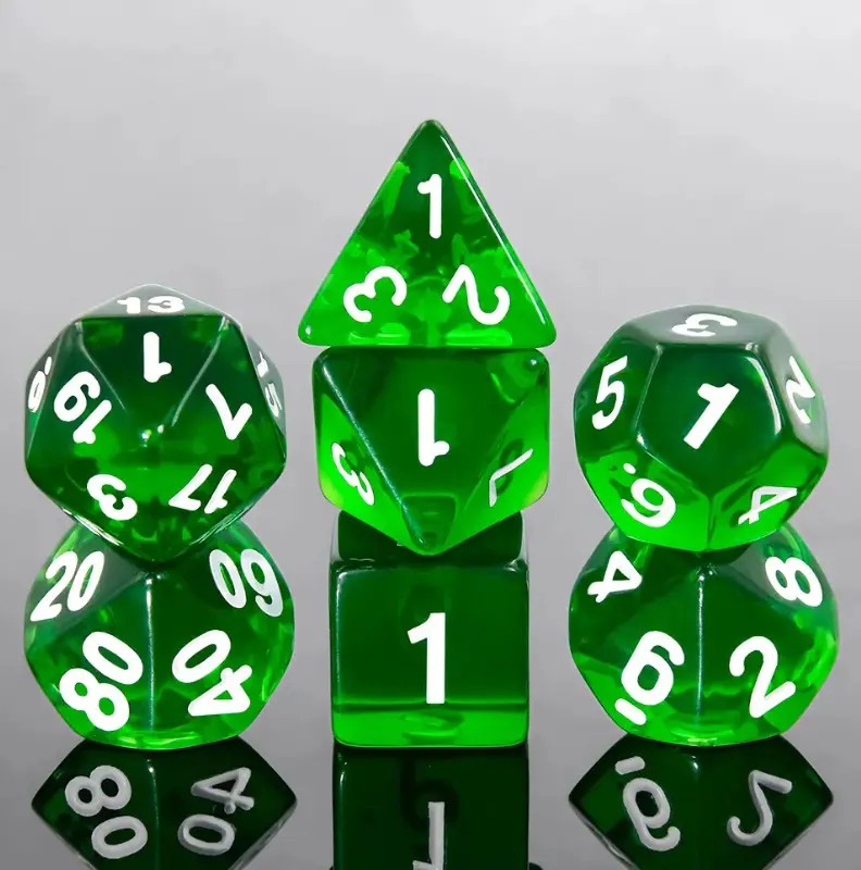 Kryształowe, zielone kości do gier fabularnych (RPG) - 7 sztuk w zestawie.