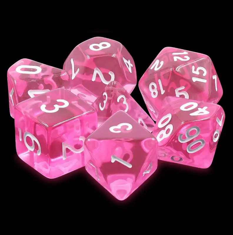 Kryształowe różowe kości do gier fabularnych (RPG) - 7 sztuk w zestawie.