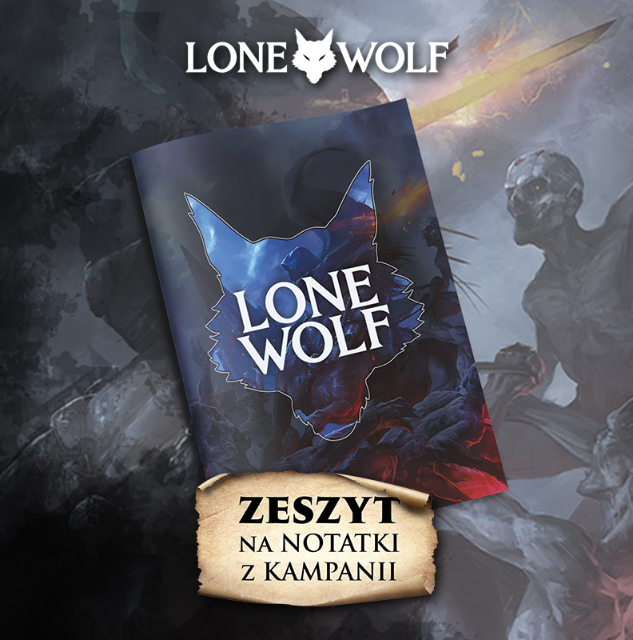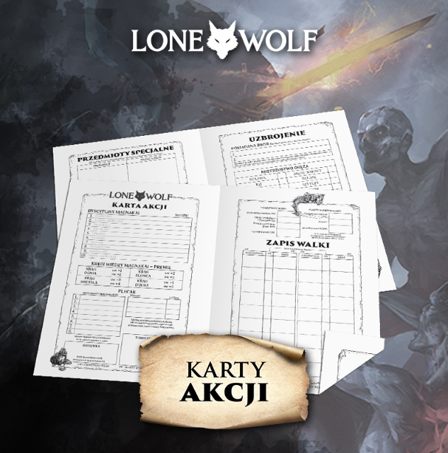 Lone Wolf: Zestaw gadżetów Magnakai to zeszyt na notatki z kampanii, dwie wydrukowane karty akcji oraz ołówek z logo serii.