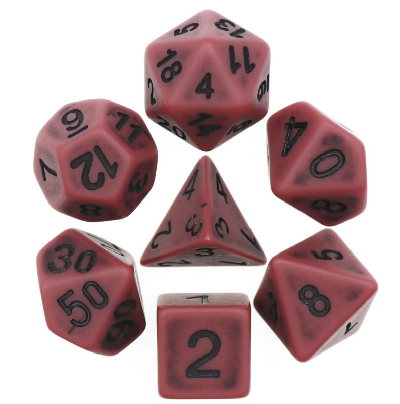 Czerwone, postarzane (malowane na czarno) kości do gier fabularnych (RPG) - 7 sztuk w zestawie.
