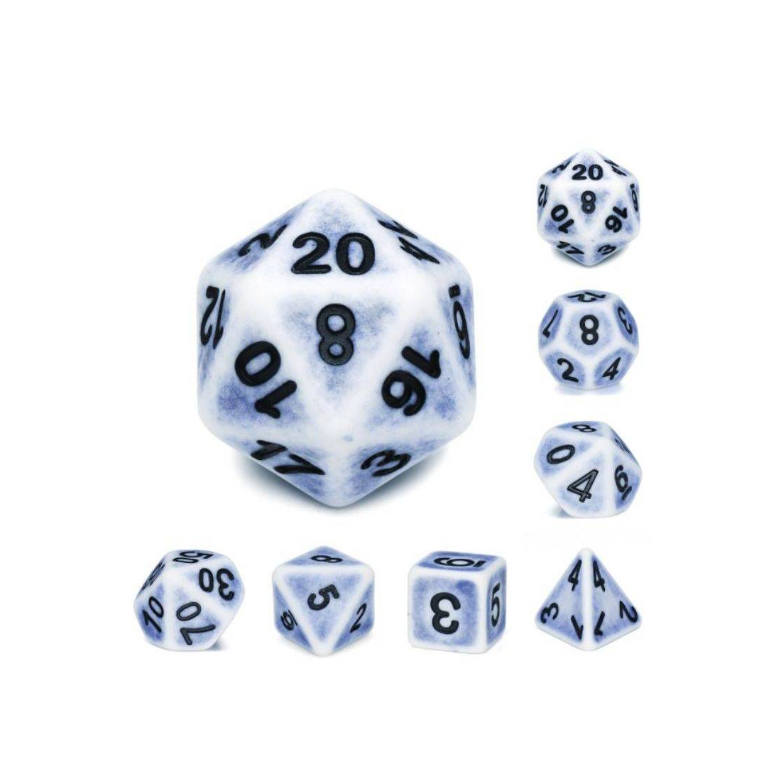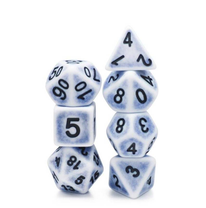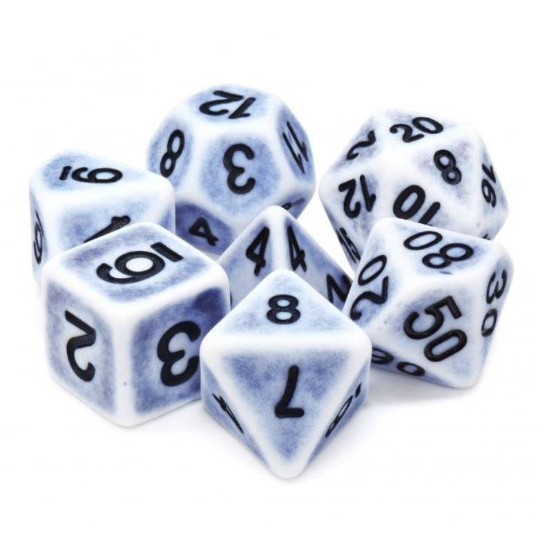Białe, postarzane (malowane na czarno) kości do gier fabularnych (RPG) - 7 sztuk w zestawie.