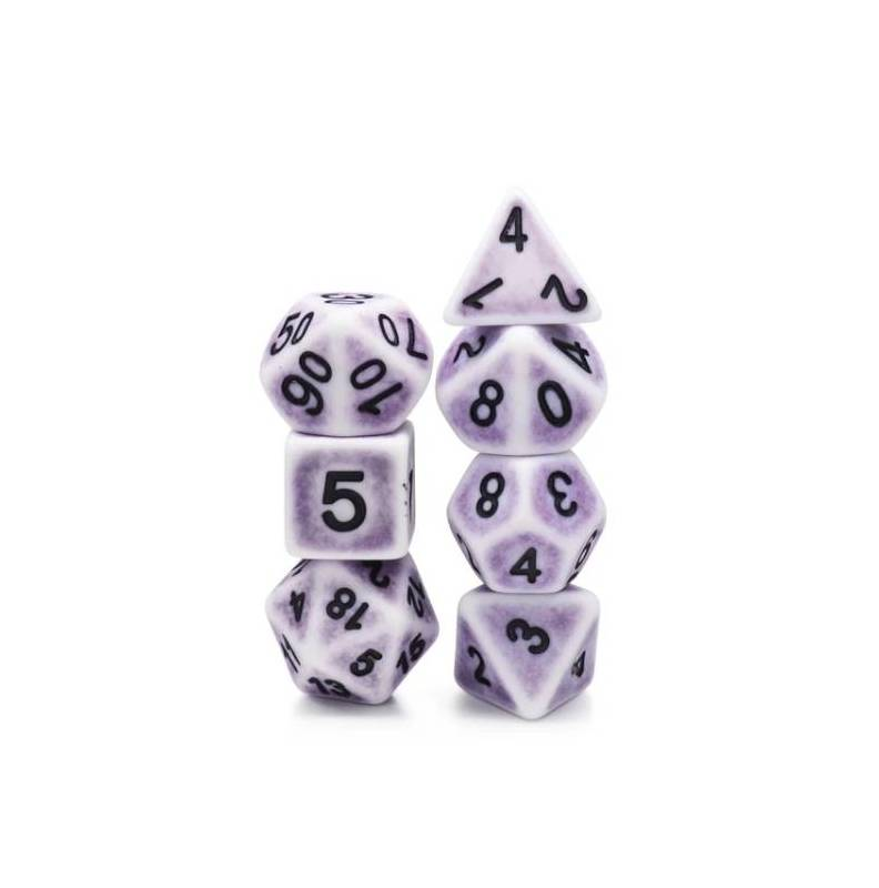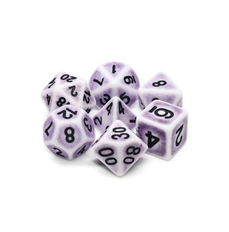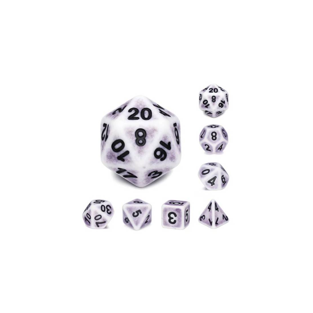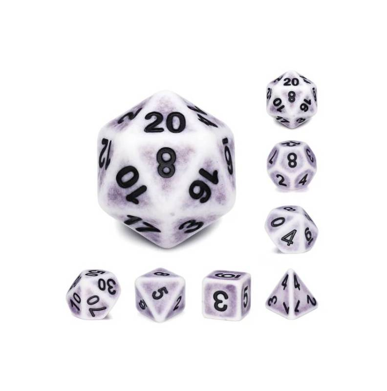 Białe, postarzane (malowane na grafitowo) kości do gier fabularnych (RPG) - 7 sztuk w zestawie.