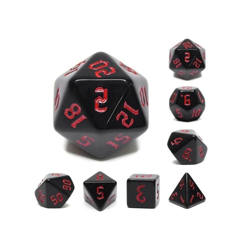 Czarne kości do gier fabularnych (RPG) z czerwonymi numerami - 7 sztuk w zestawie. Te kości charakteryzują się głębią koloru i unikalną, gotycką czcionką.