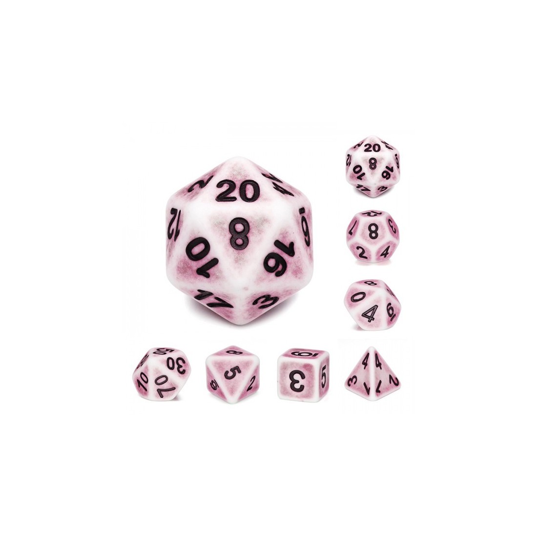 Białe, postarzane (malowane na różowo) kości do gier fabularnych (RPG) - 7 sztuk w zestawie.