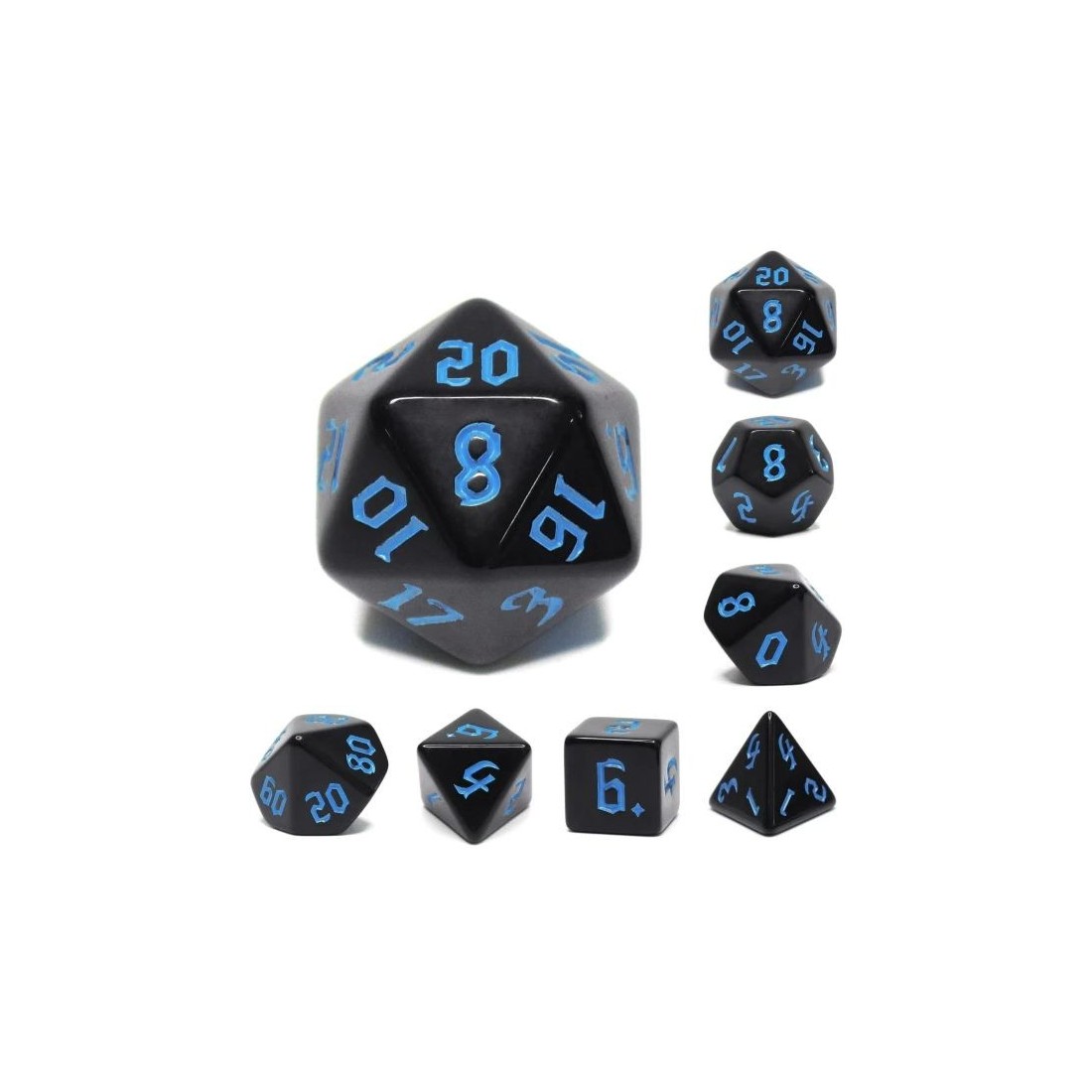 Czarne kości do gier fabularnych (RPG) z niebieskimi numerami - 7 sztuk w zestawie. Te kości charakteryzują się głębią koloru i unikalną, gotycką czcionką.