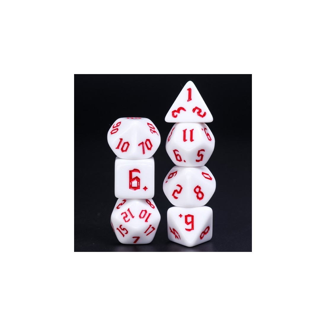 Białe kości do gier fabularnych (RPG) z czerwonymi numerami - 7 sztuk w zestawie. Te kości charakteryzują się głębią koloru i unikalną, gotycką czcionką.