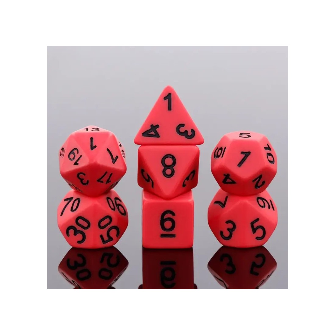 Kości w kolorze czerwonym, dedykowane do gier fabularnych (RPG), z wyraźnymi, czarnymi cyframi - 7 sztuk w zestawie.