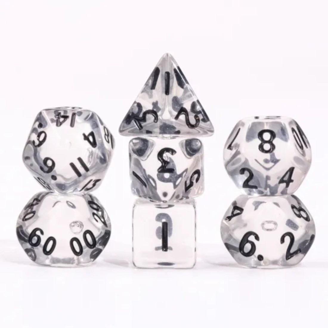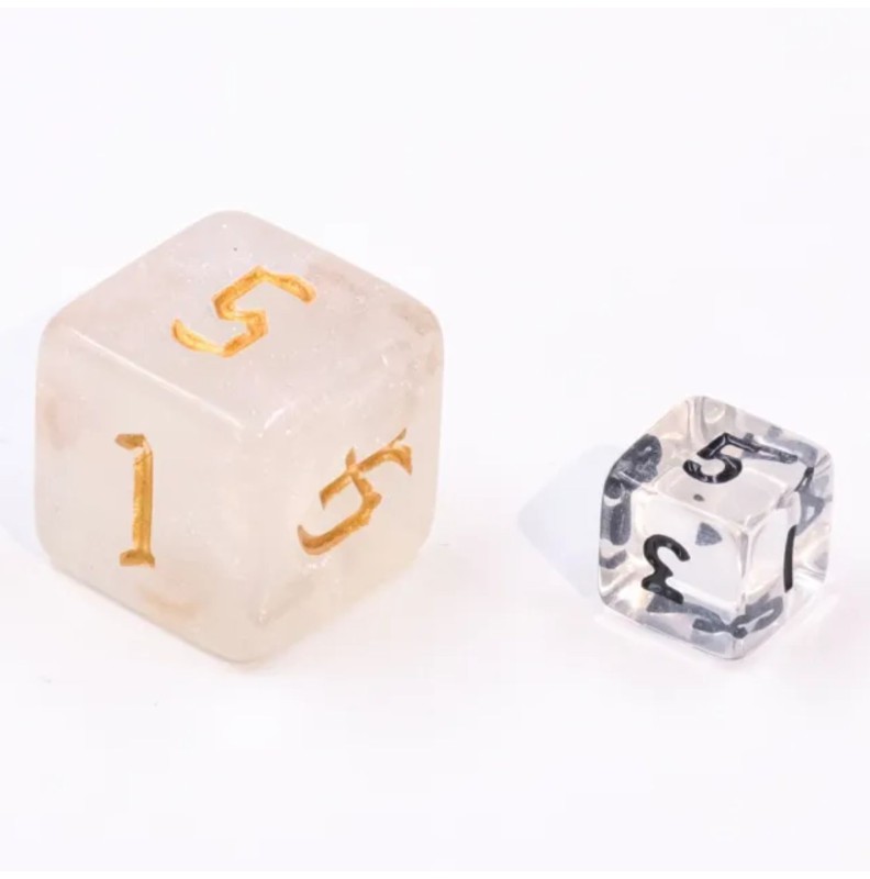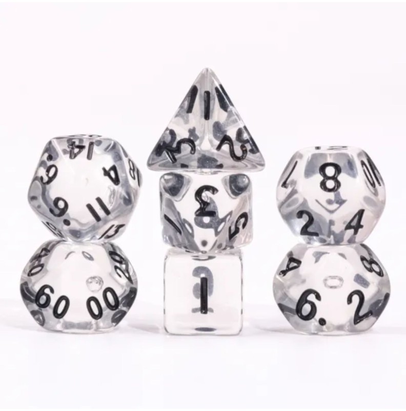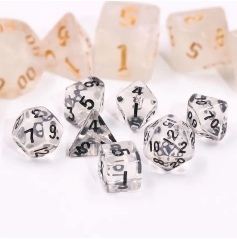 Kości wysyłane w woreczkach strunowych, zawierają 7 kości: k4, k6, k8, k10 (jedności), k10 (dziesiątki), k12, k20 w rozmiarze MINI.