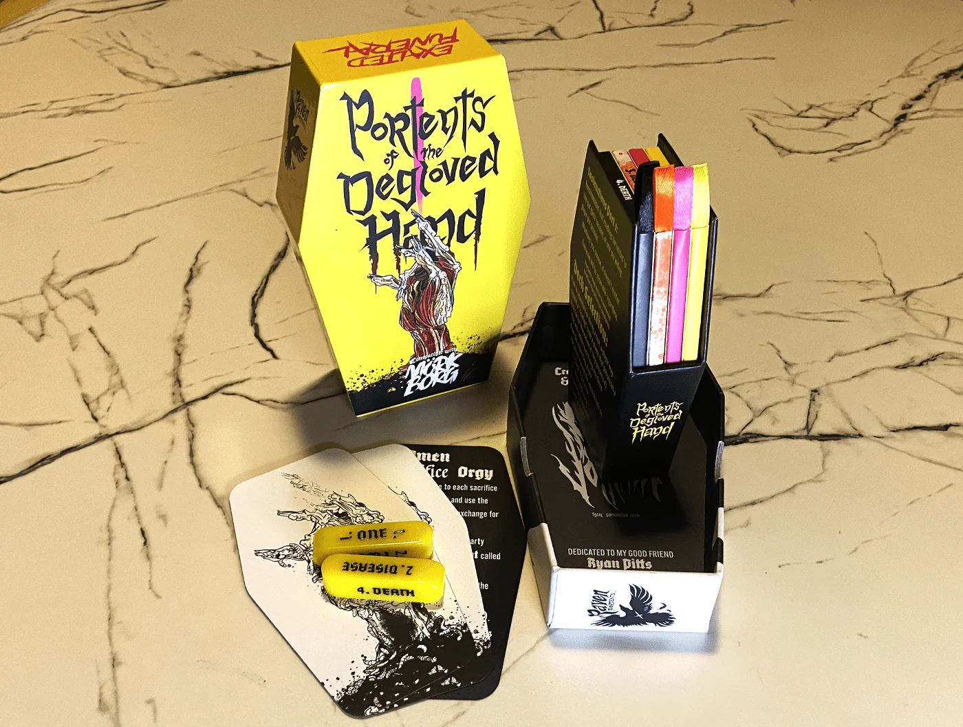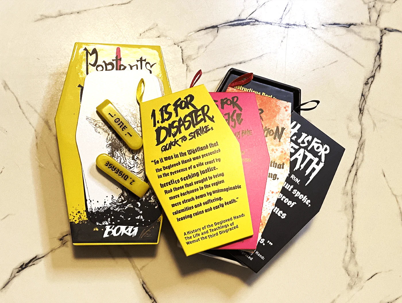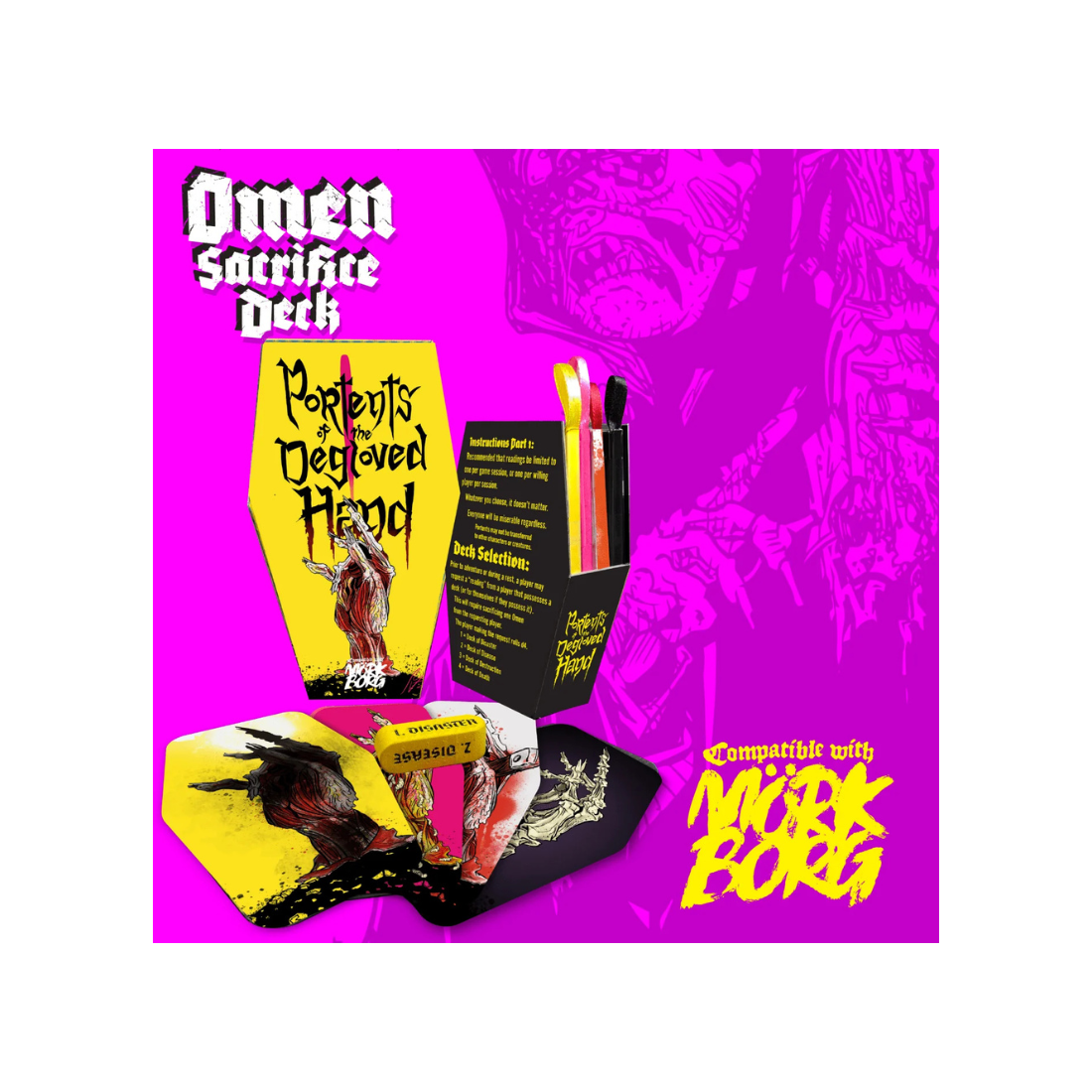 Portents of the Degloved Hand is an “Omen Sacrifice Deck” designed specifically for MÖRK BORG under the Third Party License. This deck allows players to give up a character’s omen at the beginning of a playing session (or during a break) and exchange it for a “reading” that gives the character a portent. Exchanging an omen for a portent is a simple and quick two-step process that involves rolling a 4-sided die and drawing a random card from a deck determined by the die roll.