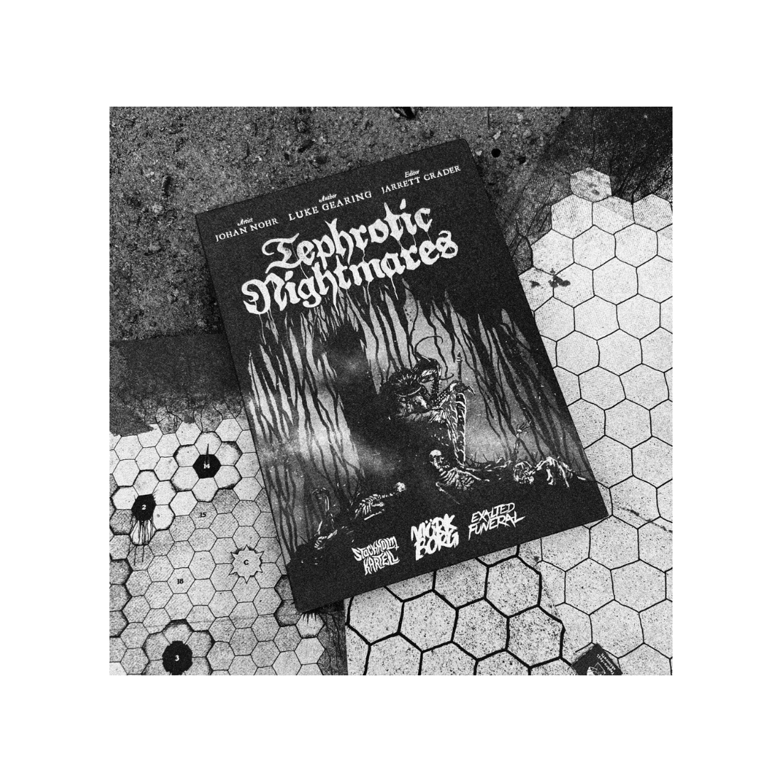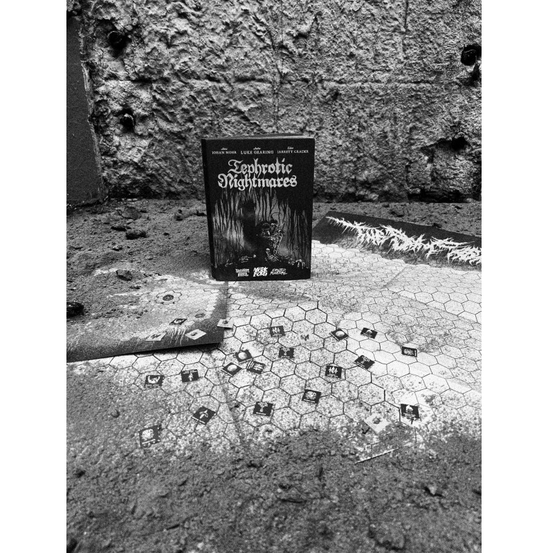 Tephrotic Nightmares is hexcrawl adventure campaign for MÖRK BORG written by Luke Gearing and with art and design by Johan Nohr. It's edited by Jarrett Crader.