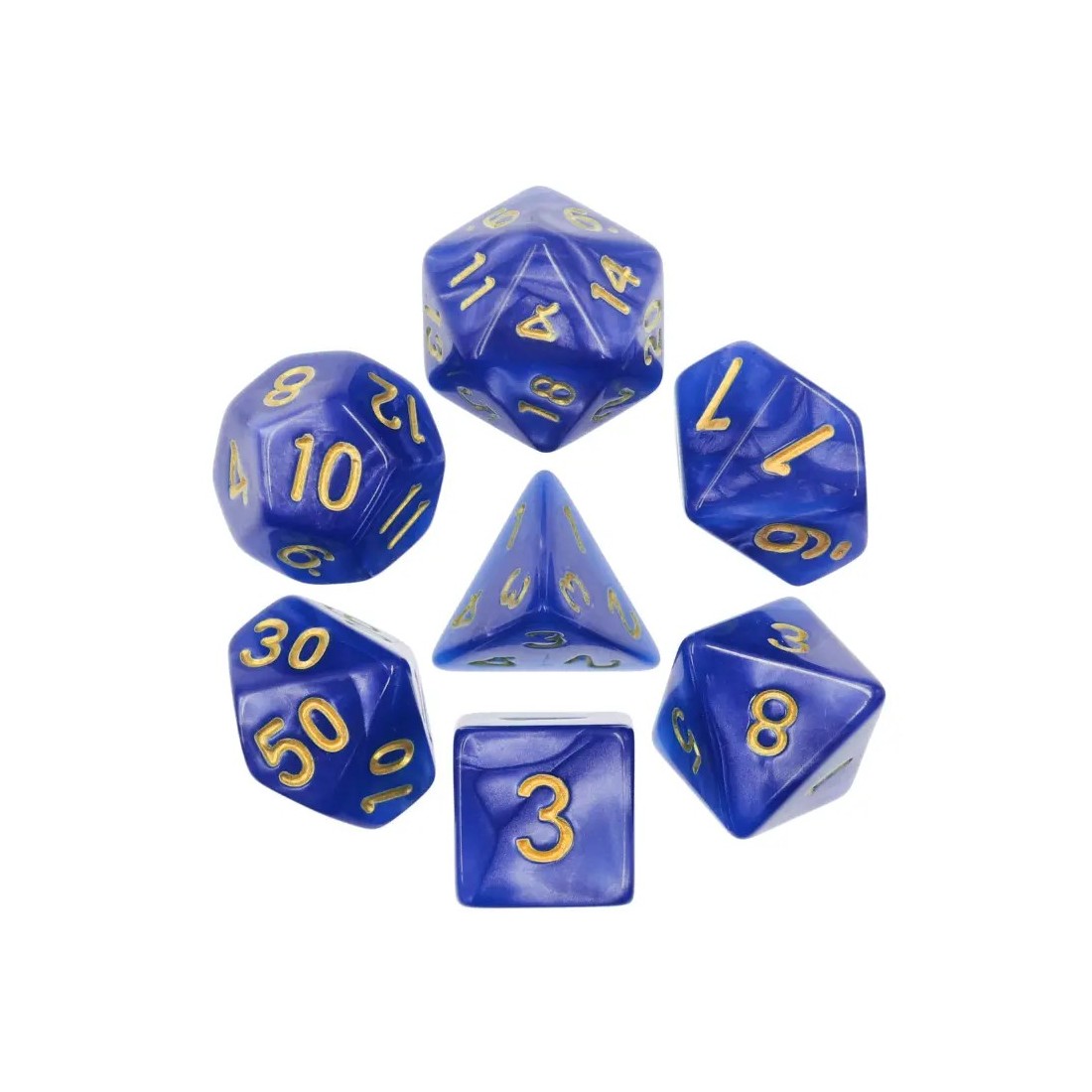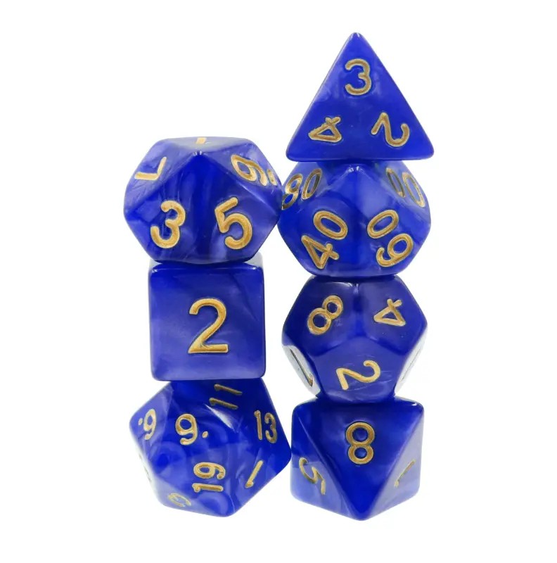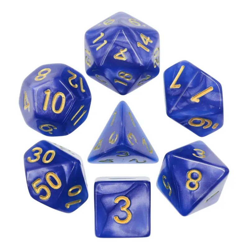 Perłowe niebieskie kości do gier fabularnych (RPG) - 7 sztuk w zestawie.