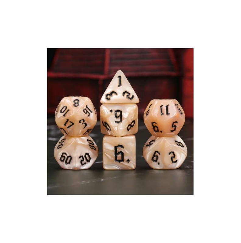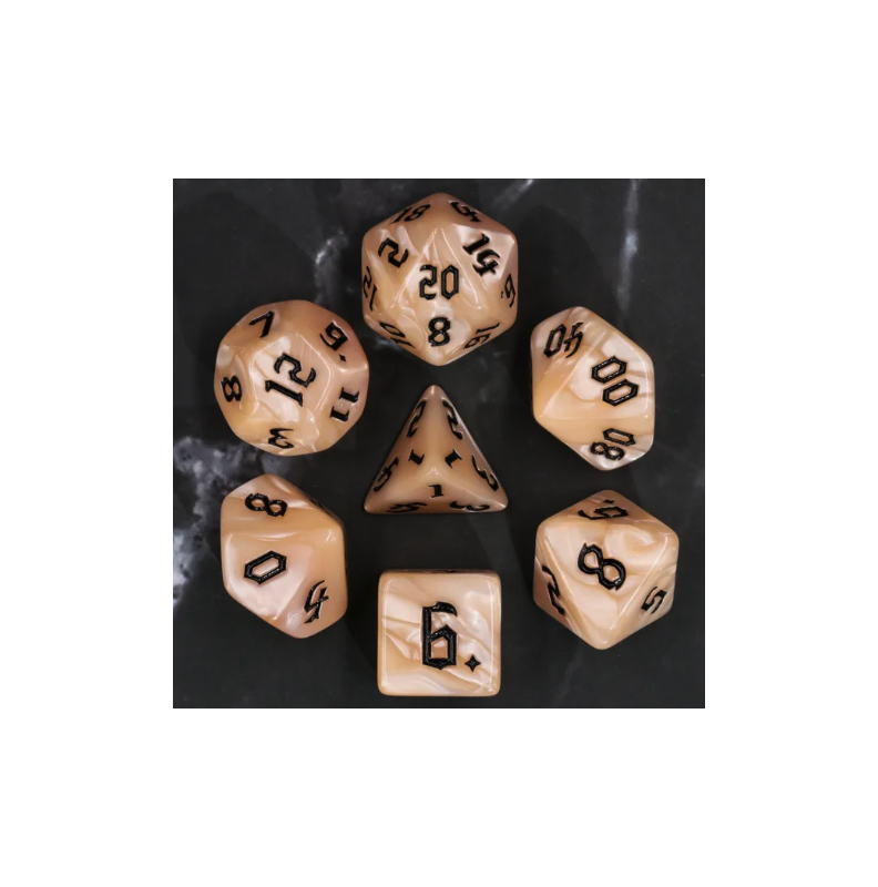 Beżowe marmurkowe kości ze złotymi cyframi do gier fabularnych (RPG) - 7 sztuk w zestawie.