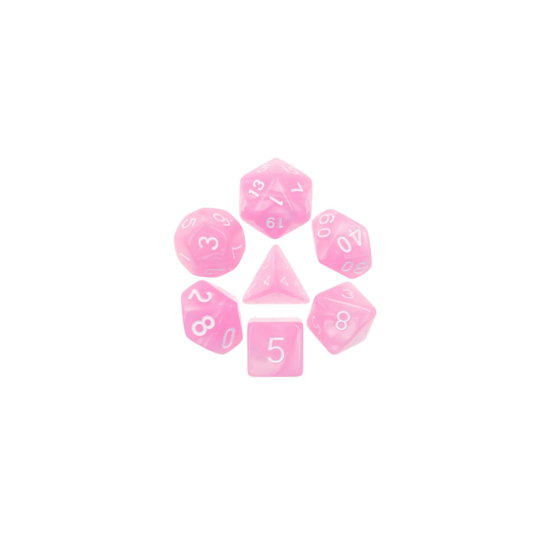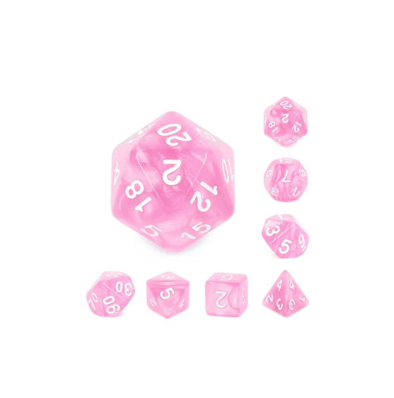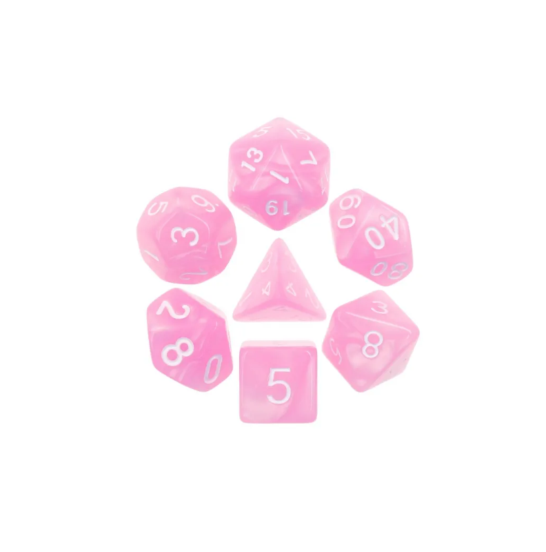 Różowe kości ze złotymi cyframi do gier fabularnych (RPG) - 7 sztuk w zestawie.