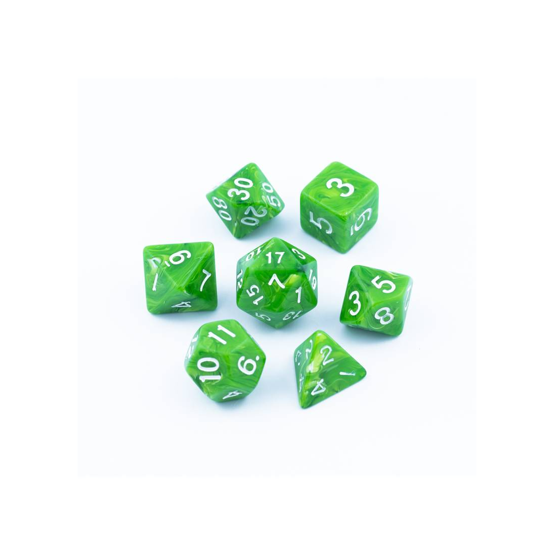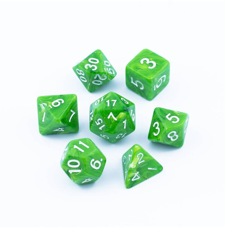 Satynowe zielone kości do gier fabularnych (RPG) - 7 sztuk w zestawie.
