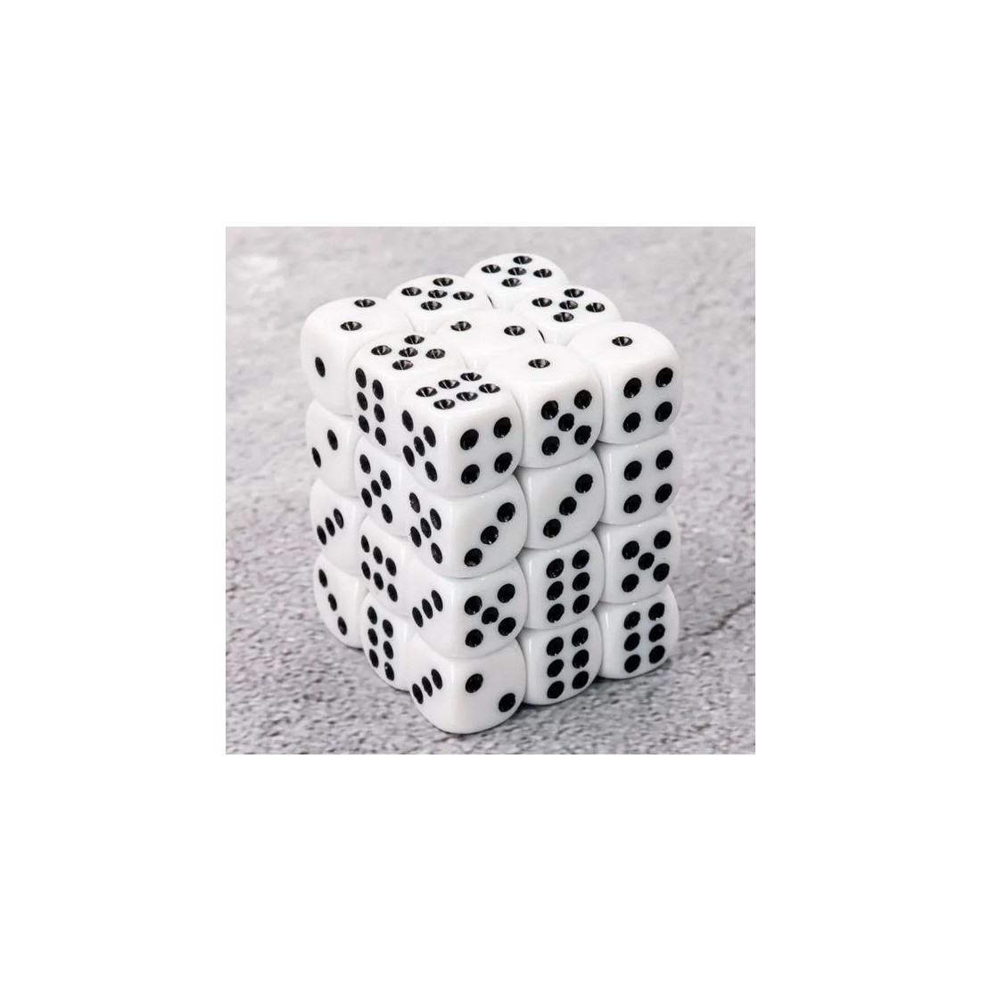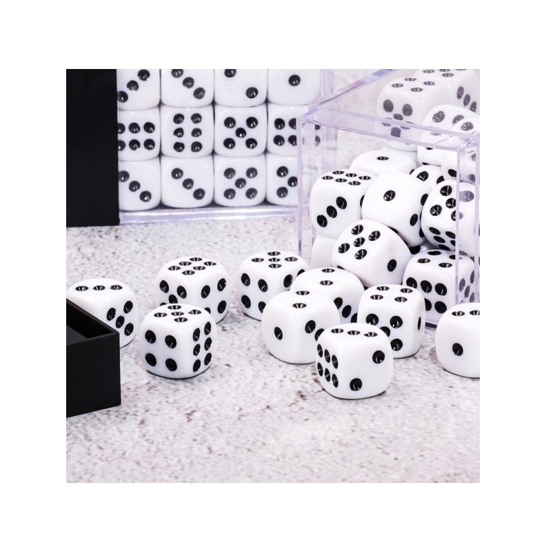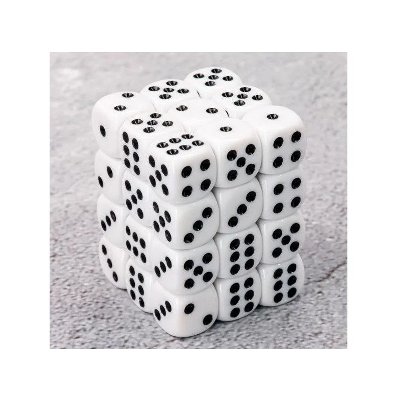 Biało - czarne kości k6 12mm do gier fabularnych (RPG), planszowych i bitewnych- 36 sztuk w zestawie, zapakowane w plastikowe pudełko w wieczkiem. Dynamiczne łączenie dwóch kolorów nadaje tym kościom wyjątkowej wyrazistości.