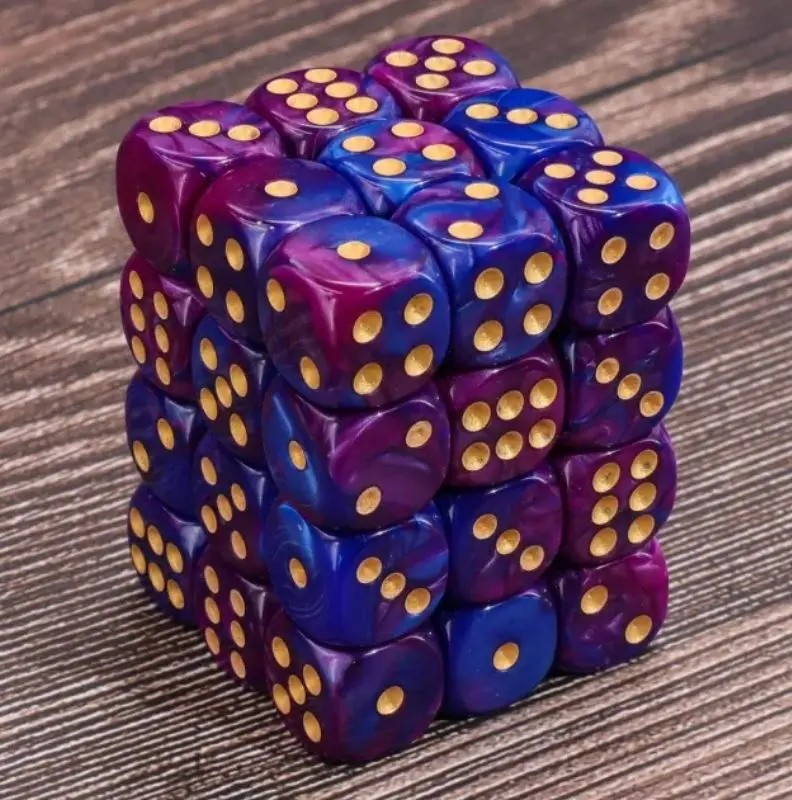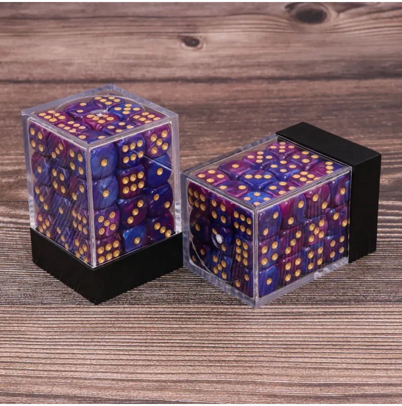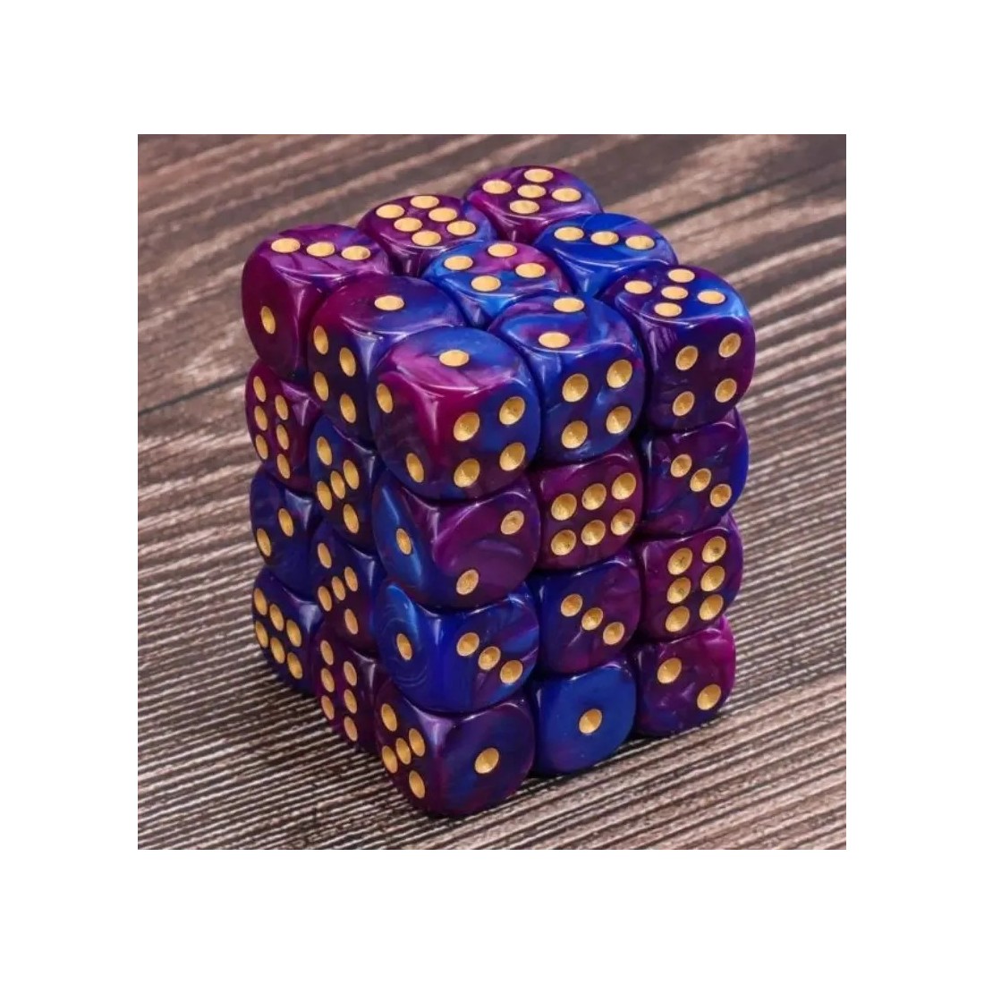 Perłowe, fioletowo - granatowe kości k6 12mm do gier fabularnych (RPG), planszowych i bitewnych- 36 sztuk w zestawie, zapakowane w plastikowe pudełko w wieczkiem.